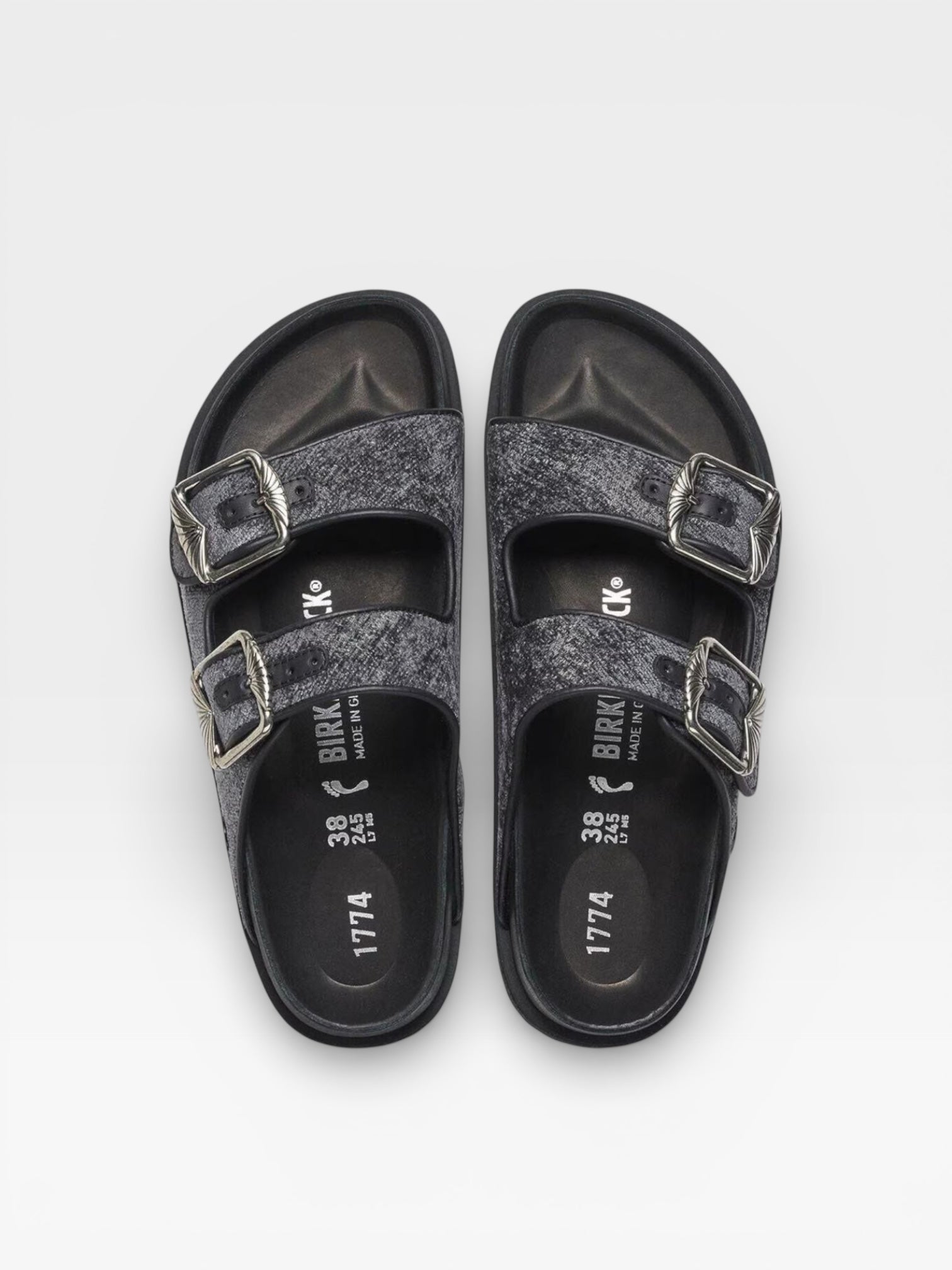 Inspired by the vibrant spirit of 1920s Berlin, this reinterpretation of the classic Arizona introduces a touch of vintage glamour with rich velvet. The luxurious upper, paired with a newly designed Art Deco–inspired buckle, blends modern craftsmanship with historical elegance to capture the bold energy and renewed sense of style that defined the era.
