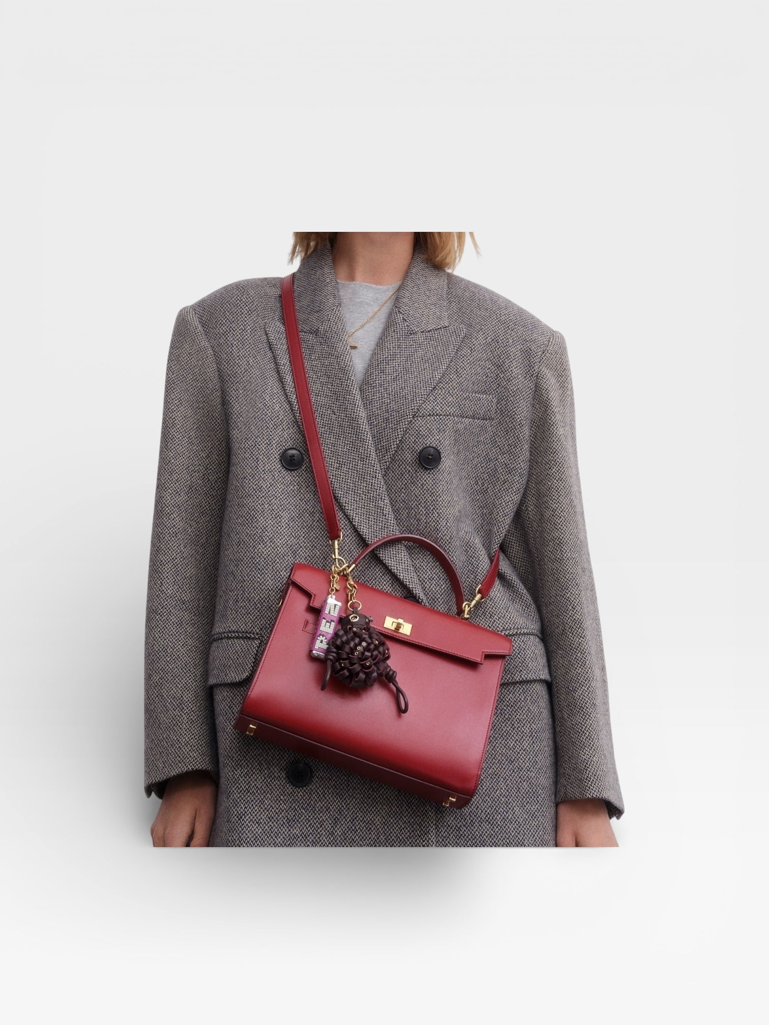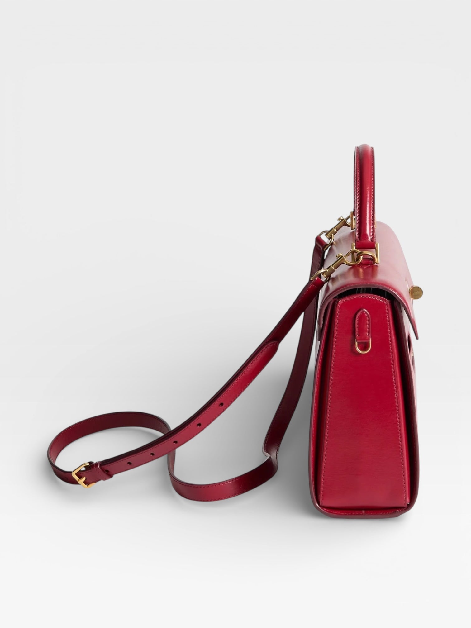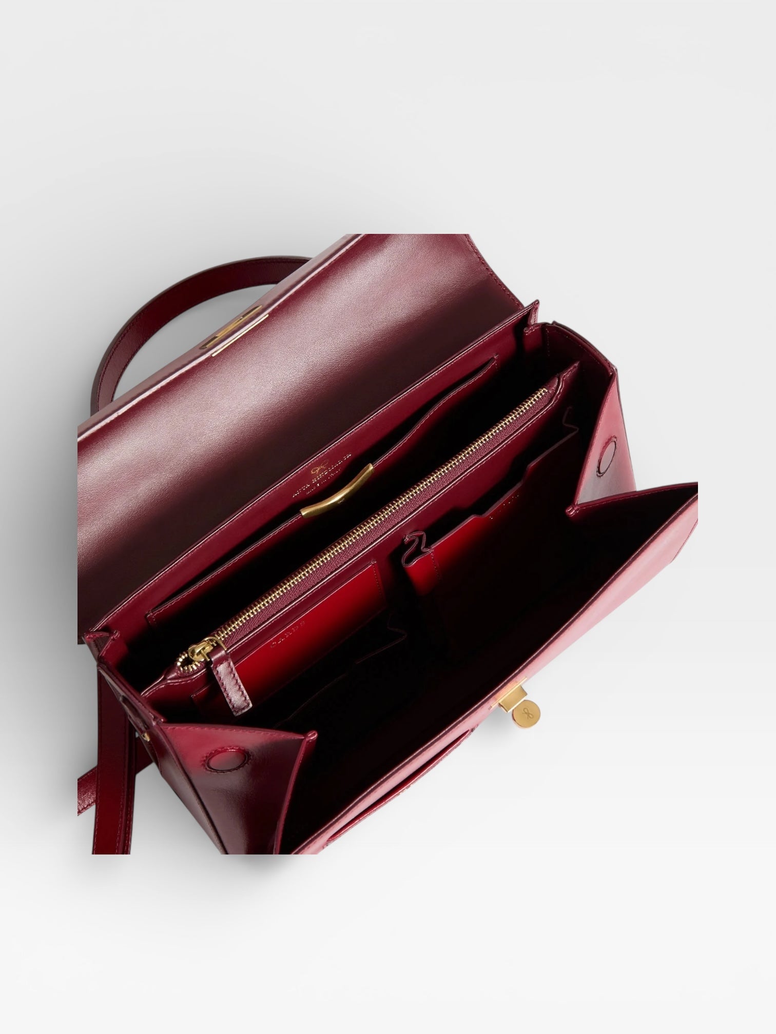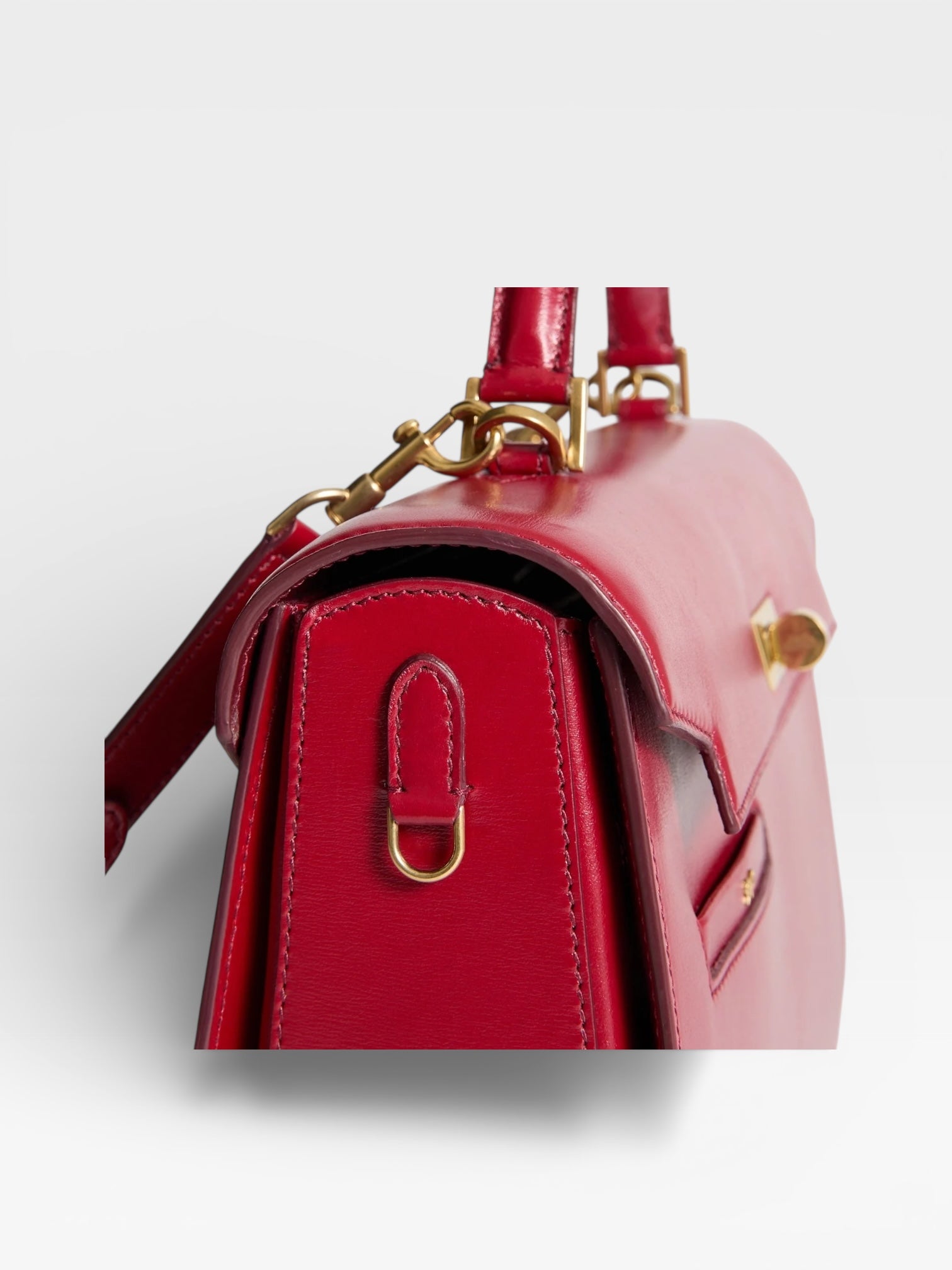 The Mortimer bag is beautifully crafted, inside and out. It is handmade in Florence from the finest, vampire-red box-calf leather, selected for both its gleam and durability. It has several compartments – one zipped, another with our handmade gold 'lip' – with pockets for your phone, cards, earphones and pen. Carry it by the top handle or style it cross-body by the optional long strap.