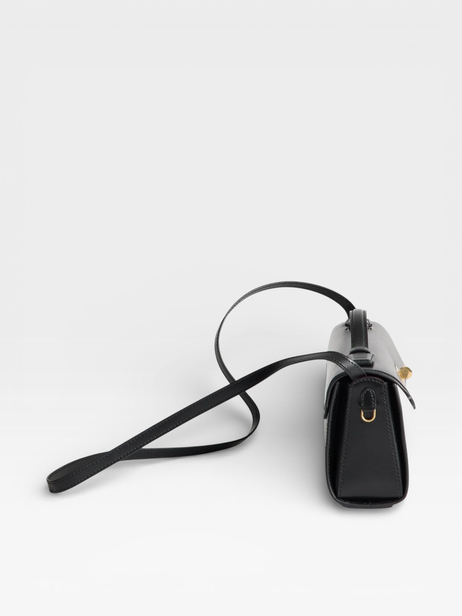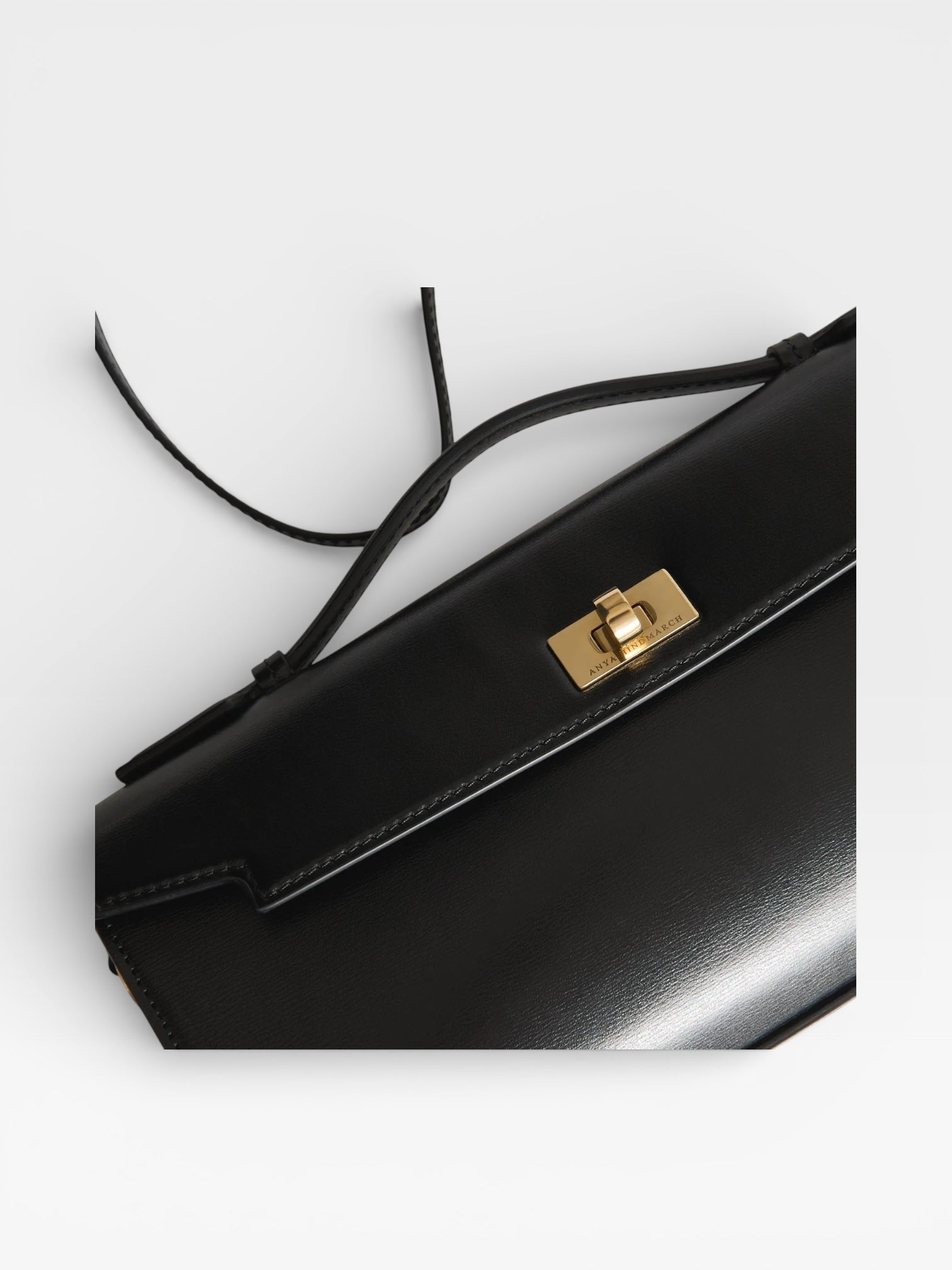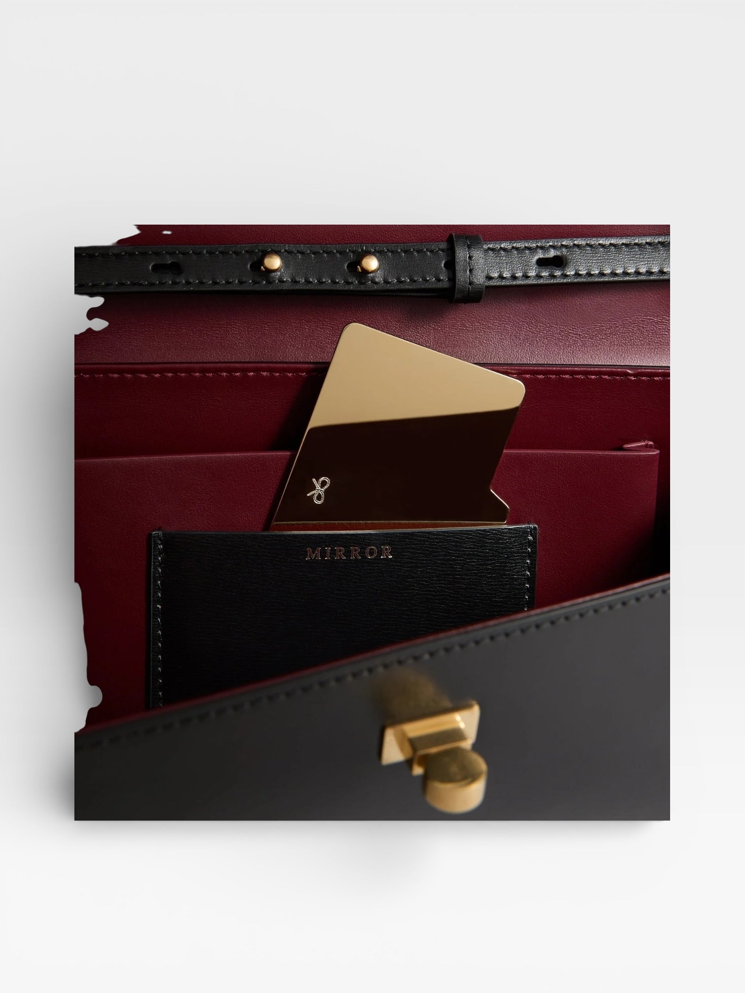 The Mortimer Clutch is the result of hours of handcraftsmanship. It is made in Florence from glossy, black, box-calf leather that has a gold rating from the Leather Working Group – the highest certification a tannery can receive for environmental and social practices. The interior is lined in vampire-red satin leather and fitted with a pocket for your phone, a smaller compartment for a lipstick, and a gold mirror – with its own labelled slot. Carry it as a clutch, by the top handle, or by the optional long strap.