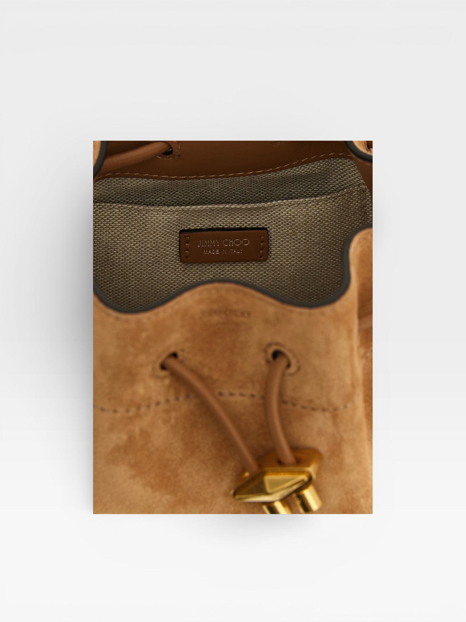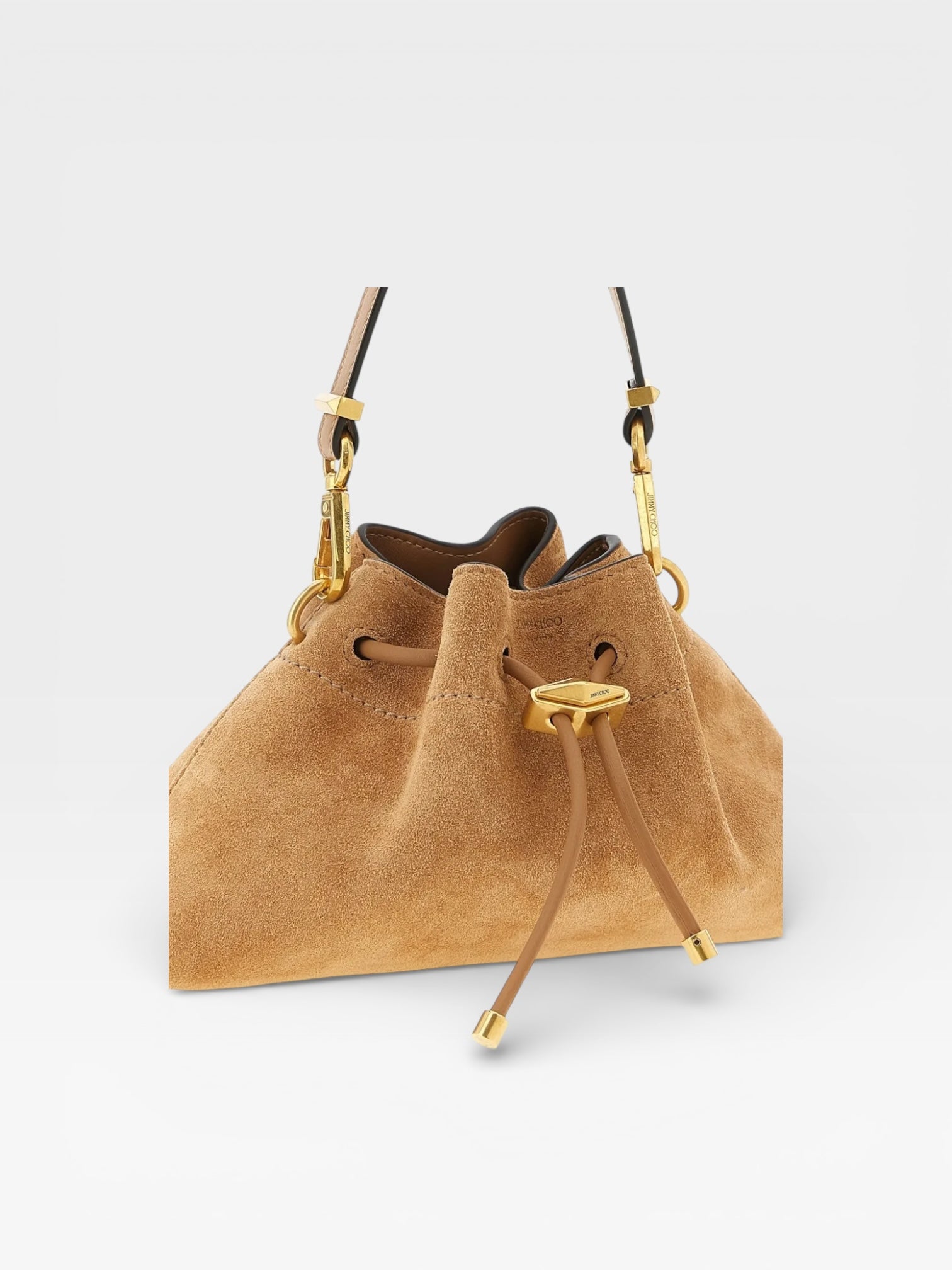 The Cinch S bag is a house signature defined by a soft and effortless silhouette that is “cinched” by a faceted Diamond drawstring closure. This definitive style is presented in supple coffee-coloured suede. It features an adjustable crossbody strap for versatile styling, and is complemented by gold-tone hardware.