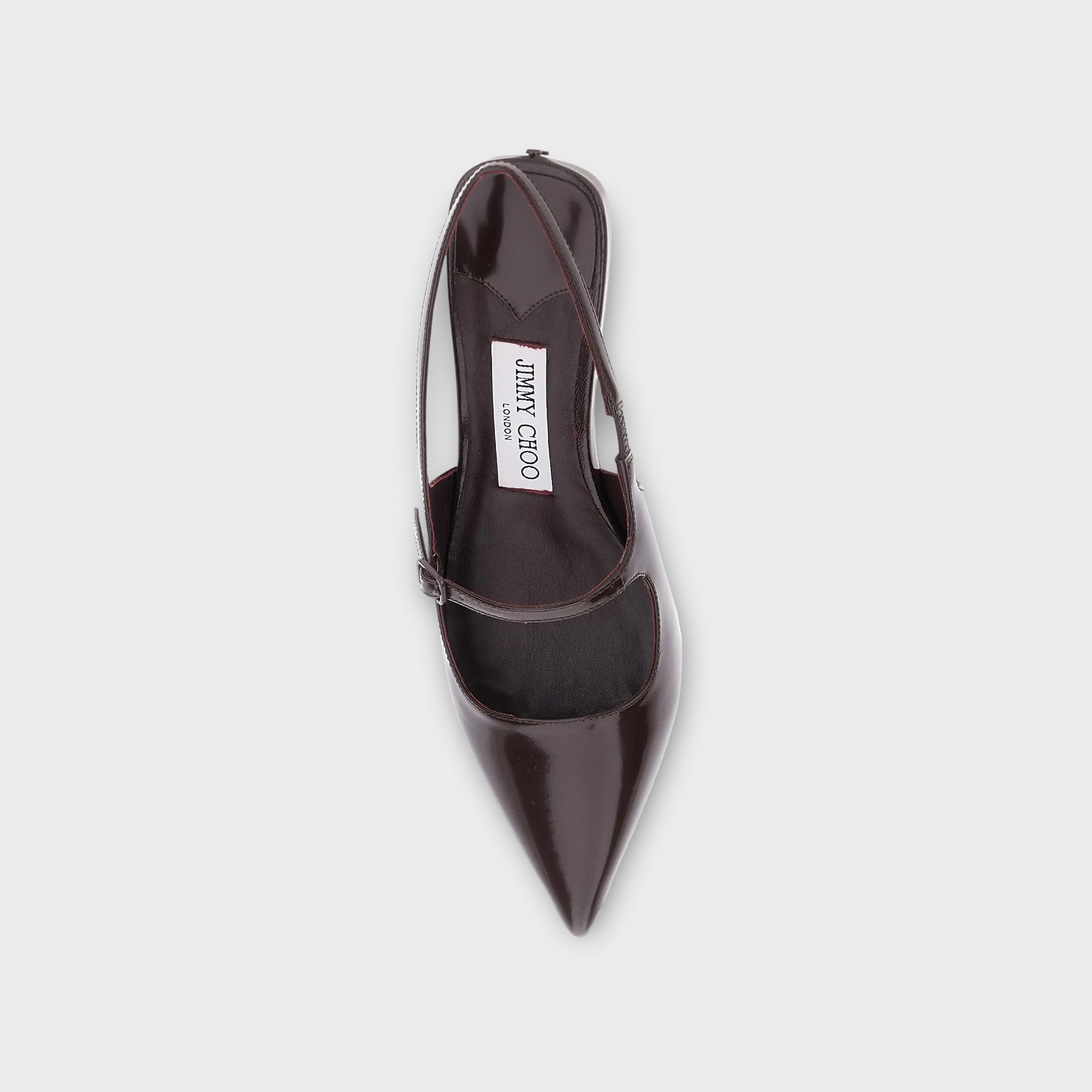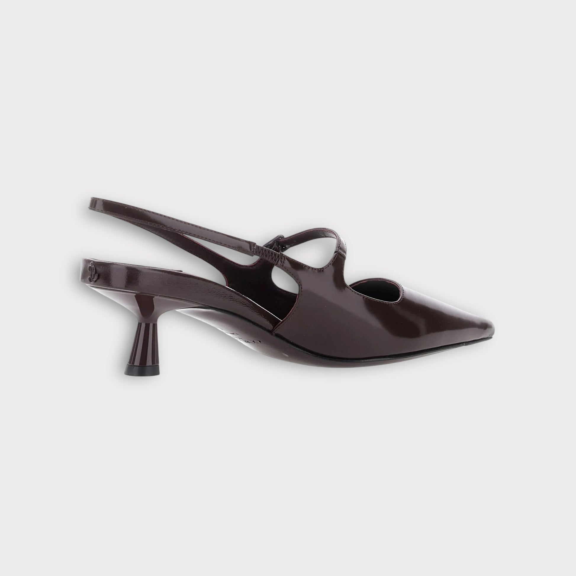 Didi in patent leather is a modern design with a pointed toe silhouette. This slingback shoe features a strap fastening and a graphic kick heel.