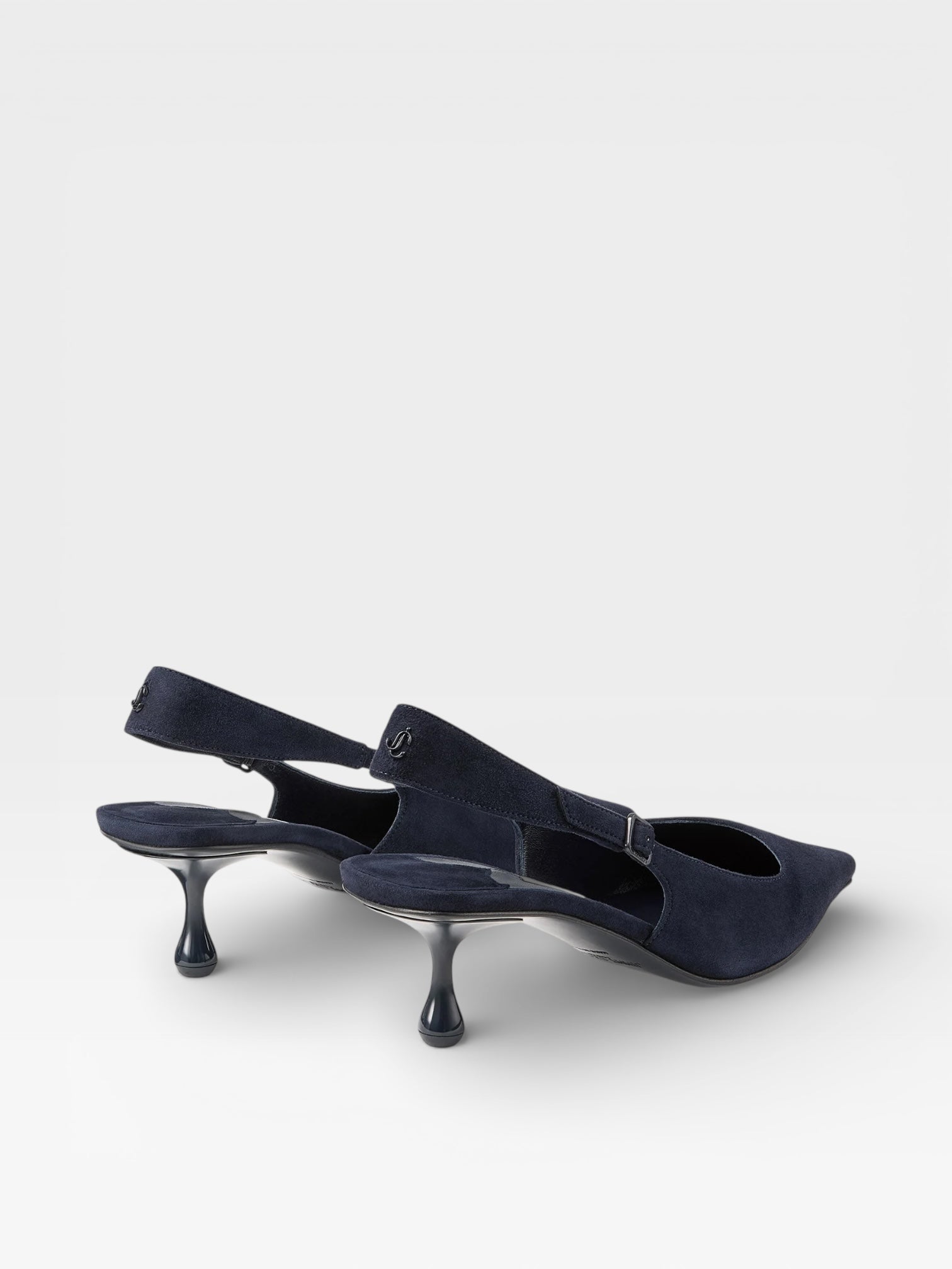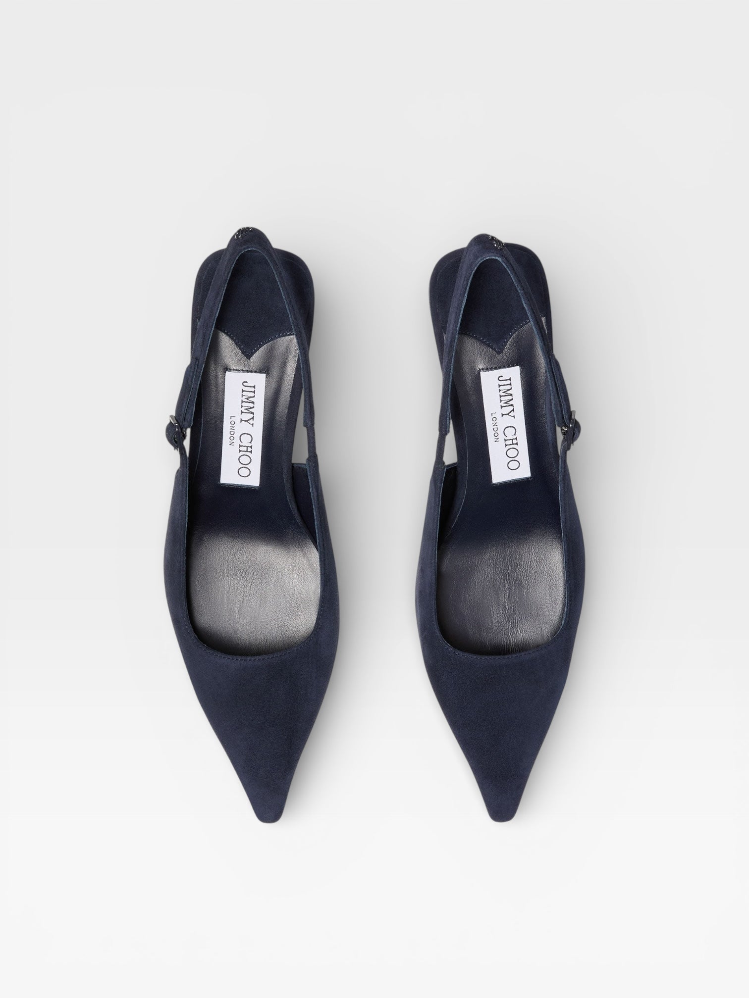 Amel is a modern take on the slingback silhouette in navy suede. Set on a 50mm ‘drop’ heel, it is defined by a subtly squared pointed toe, echoed by a squared topline which offers enhanced coverage of the foot. The slingback strap is adjustable and the sole features a rubber island, ensuring flexibility; this is in addition to the padding - designed for maximum comfort - that features in the footbed of every Jimmy Choo shoe. These sculptural details bring edge to the classic kitten heel.