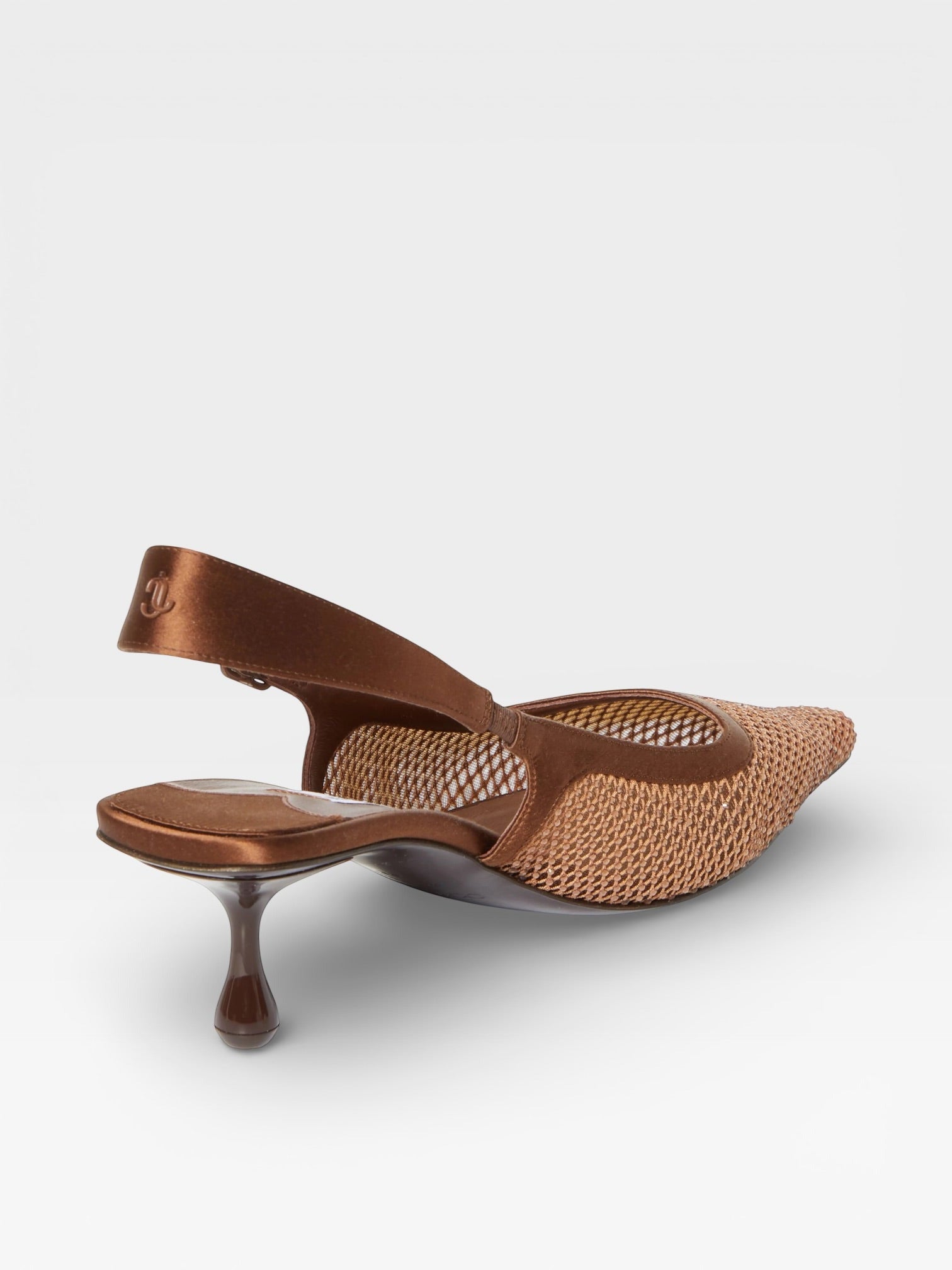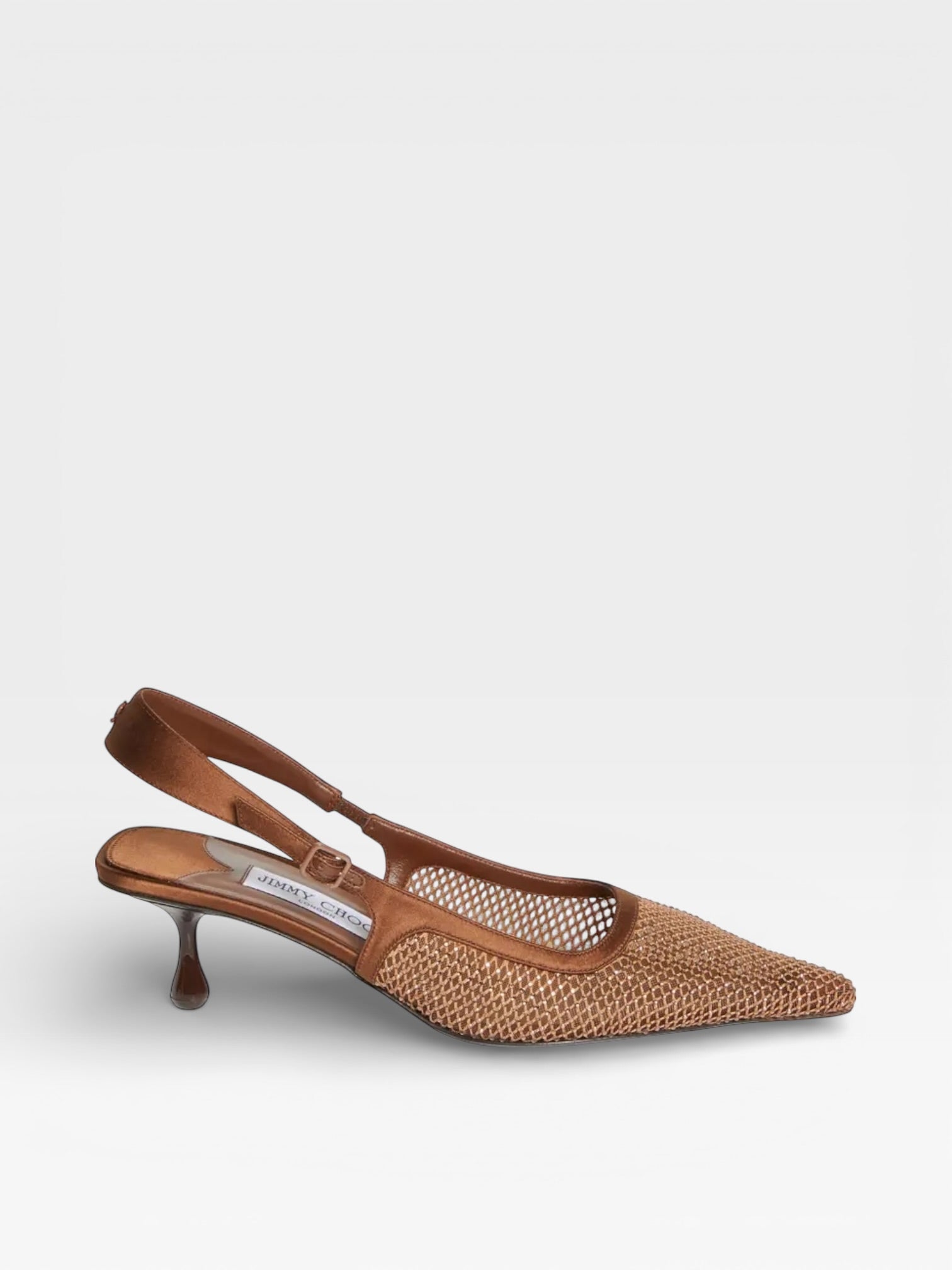 Amel is a modern take on the slingback silhouette, cast in crystal mesh and satin. Set on a 50mm ‘drop’ heel, it is defined by a pointed toe, echoed by a squared topline which offers enhanced coverage of the foot. The slingback strap is adjustable and the sole features a rubber island, ensuring flexibility; this is in addition to the padding - designed for maximum comfort - that features in the footbed of every Jimmy Choo shoe. These sculptural details bring edge to the classic kitten heel.