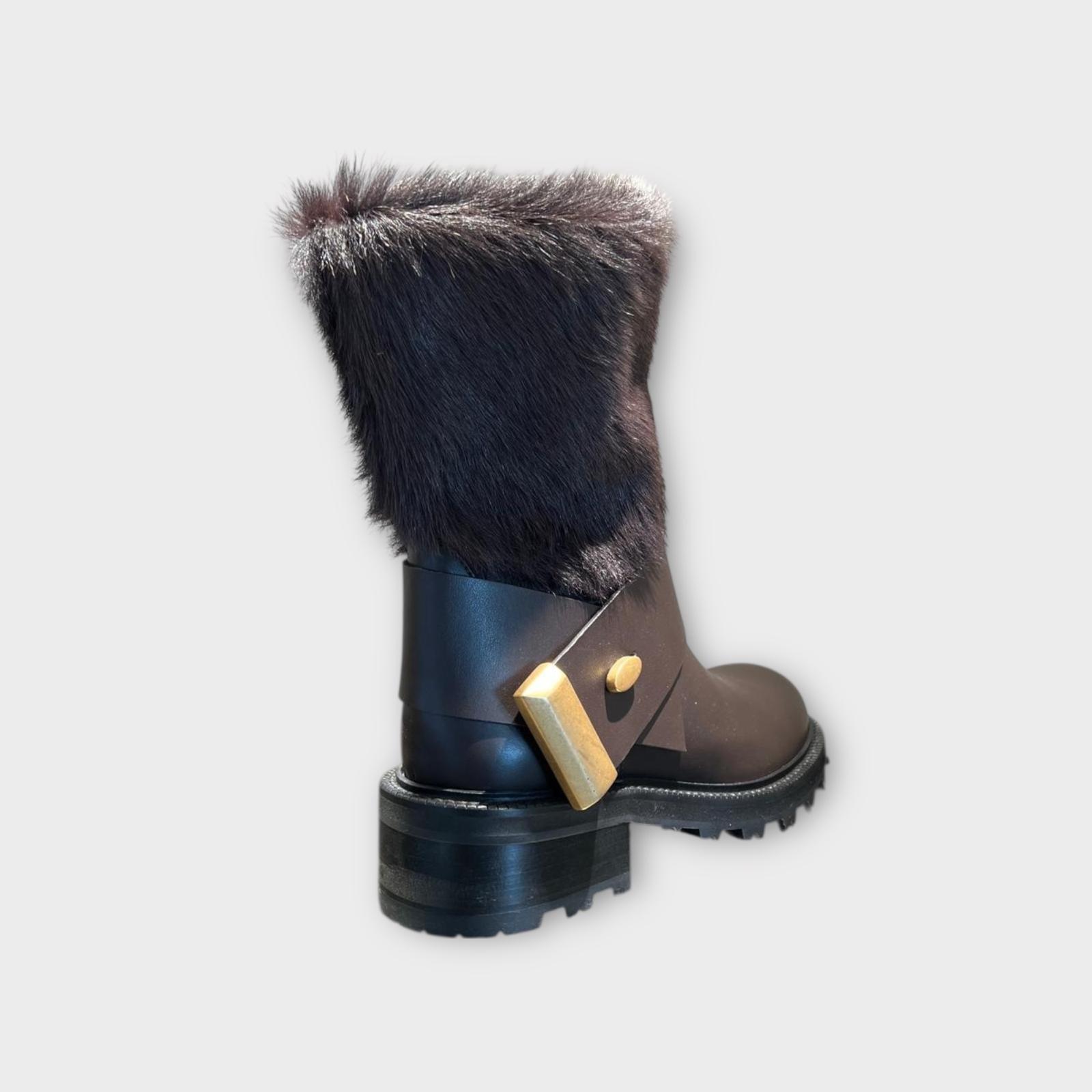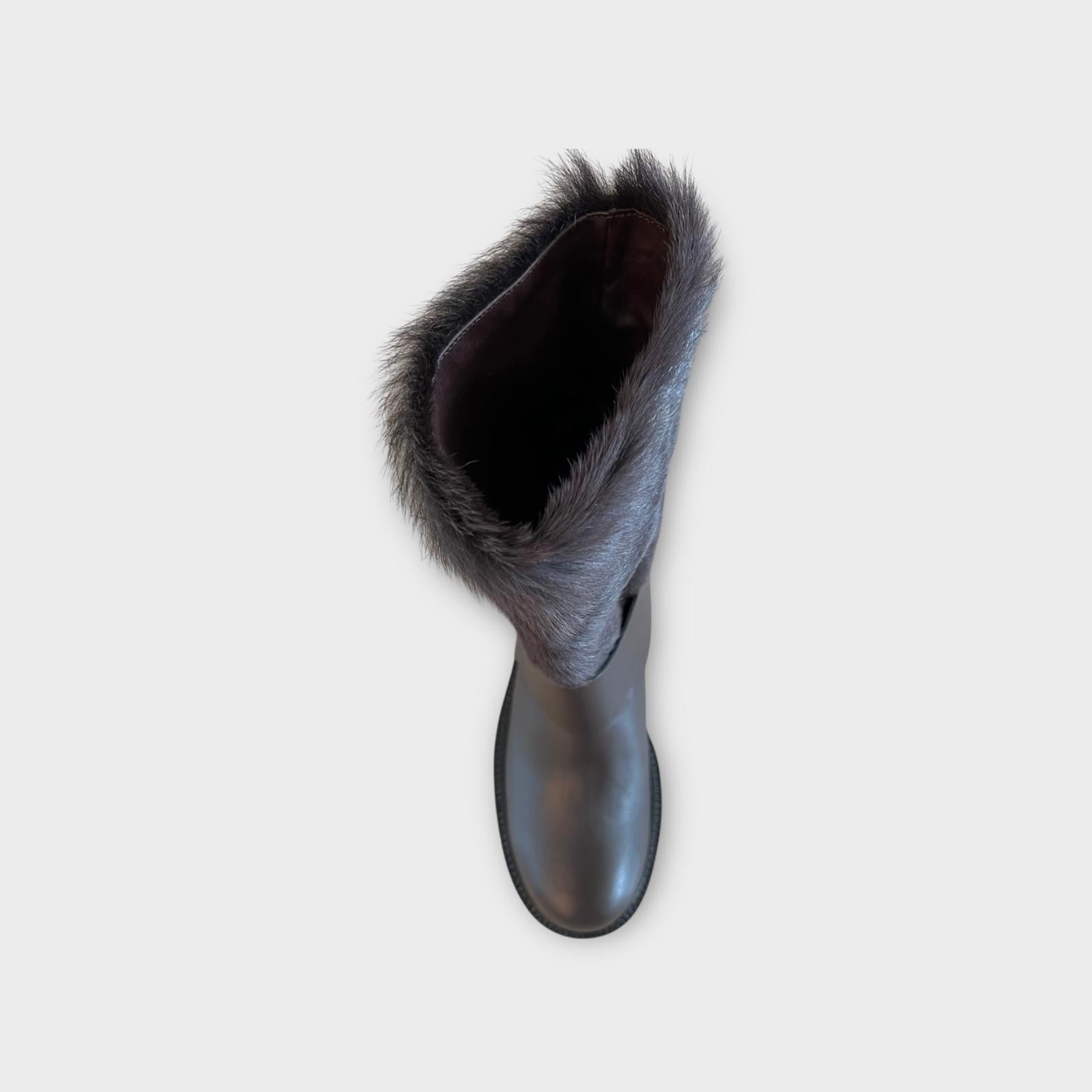 The Aribella boot, made of brown calfskin, is distinguished by its long brown pony skin shaft, which gives it a sophisticated and decisive touch. The design is enriched by a black calfskin ankle strap, embellished with an antiqued silver-coloured end-piece and swivel button. The rubber sole with a 2 cm heel guarantees comfort and practicality, perfect for a refined look with character.