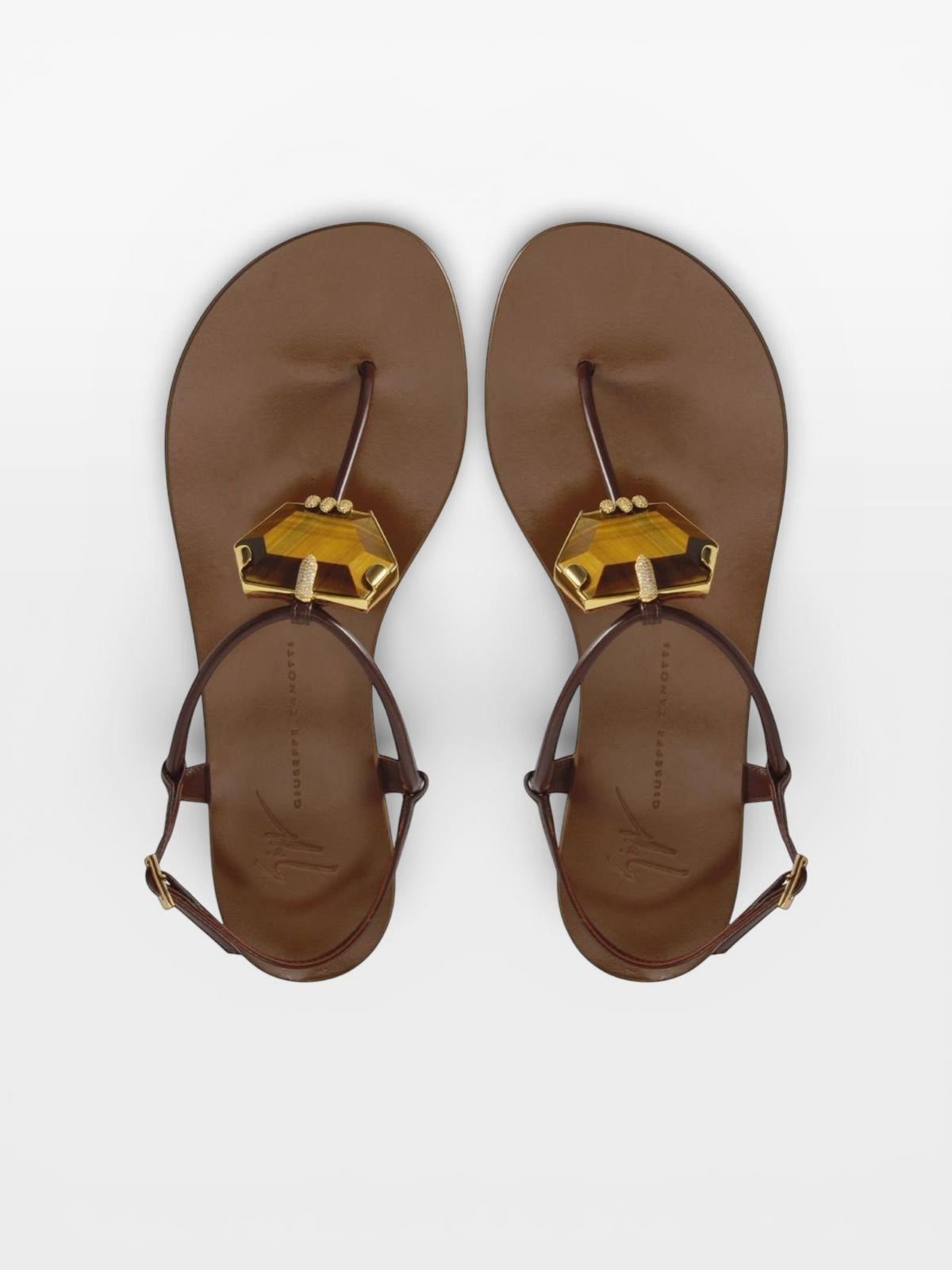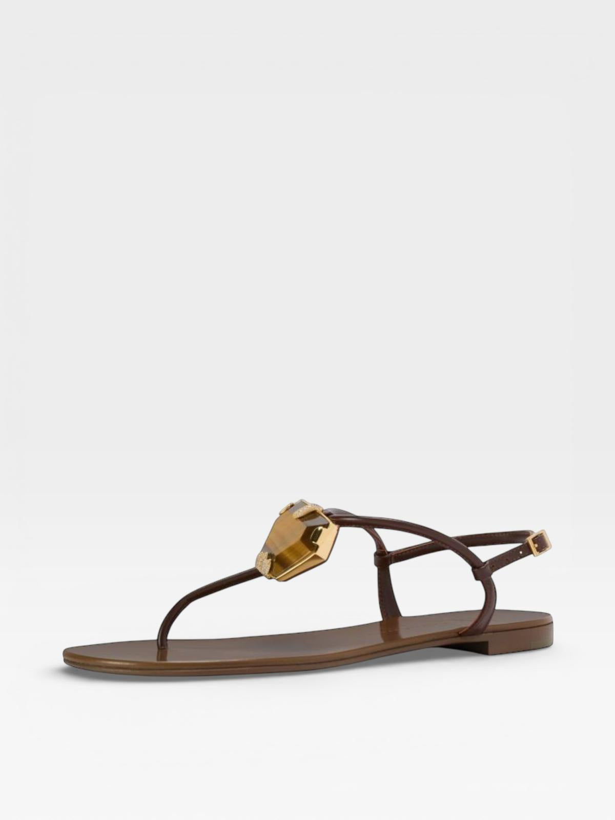 Flat thong sandals in leather with geometric metal brooch with tiger eye-effect set stone, metal buckle-adjustable strap and leather-covered insole.