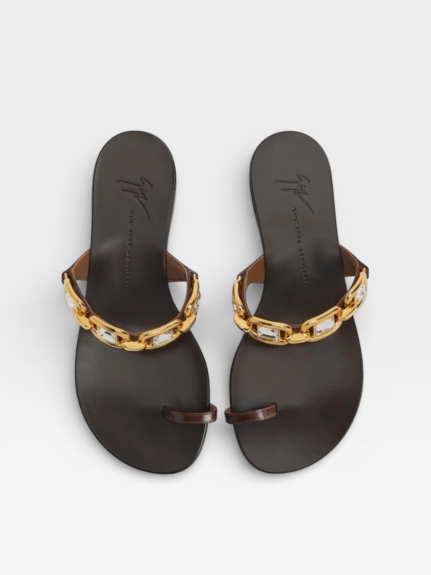 Slides toe-loop sandals in leather with gold-coloured chain accessory and set crystal-effect stones
