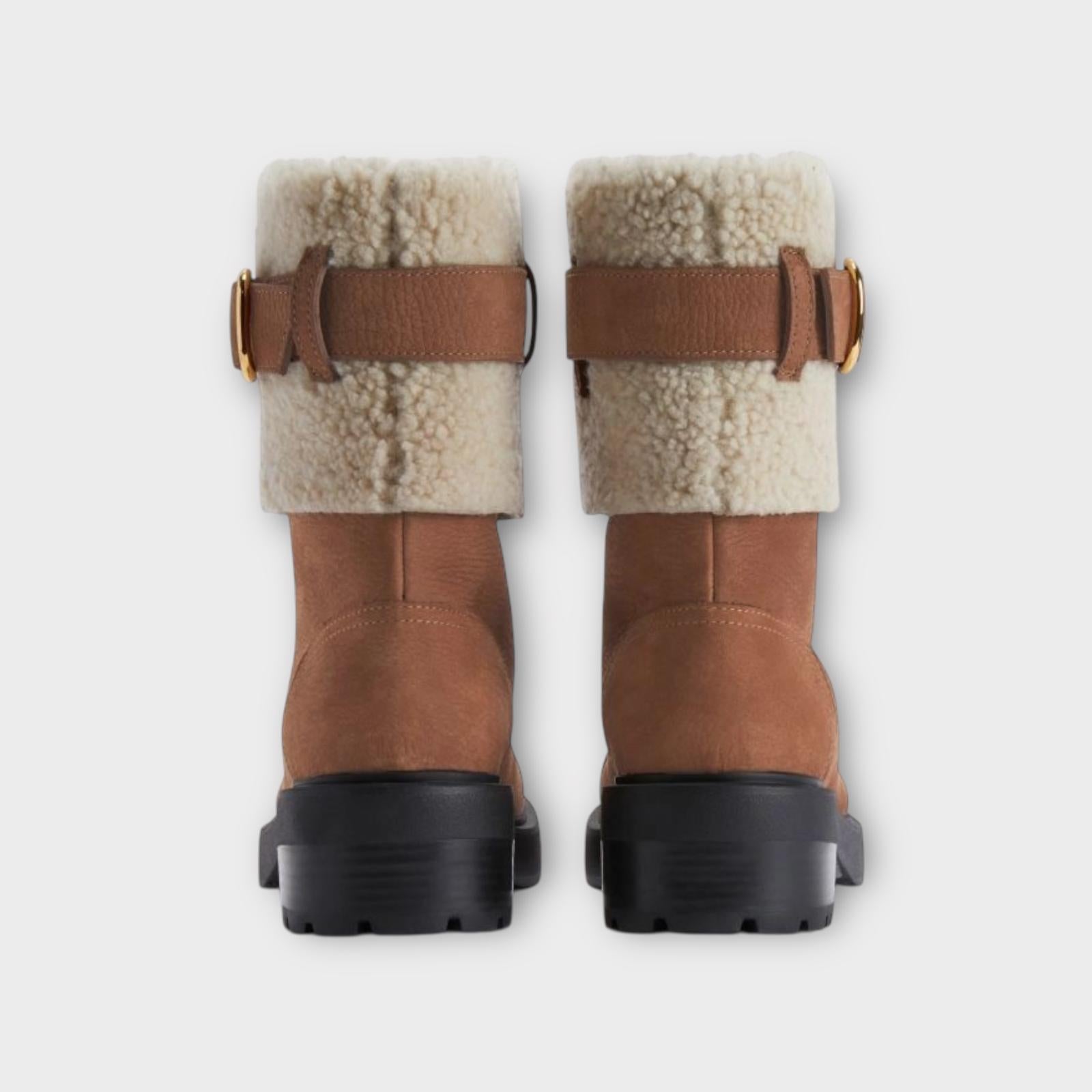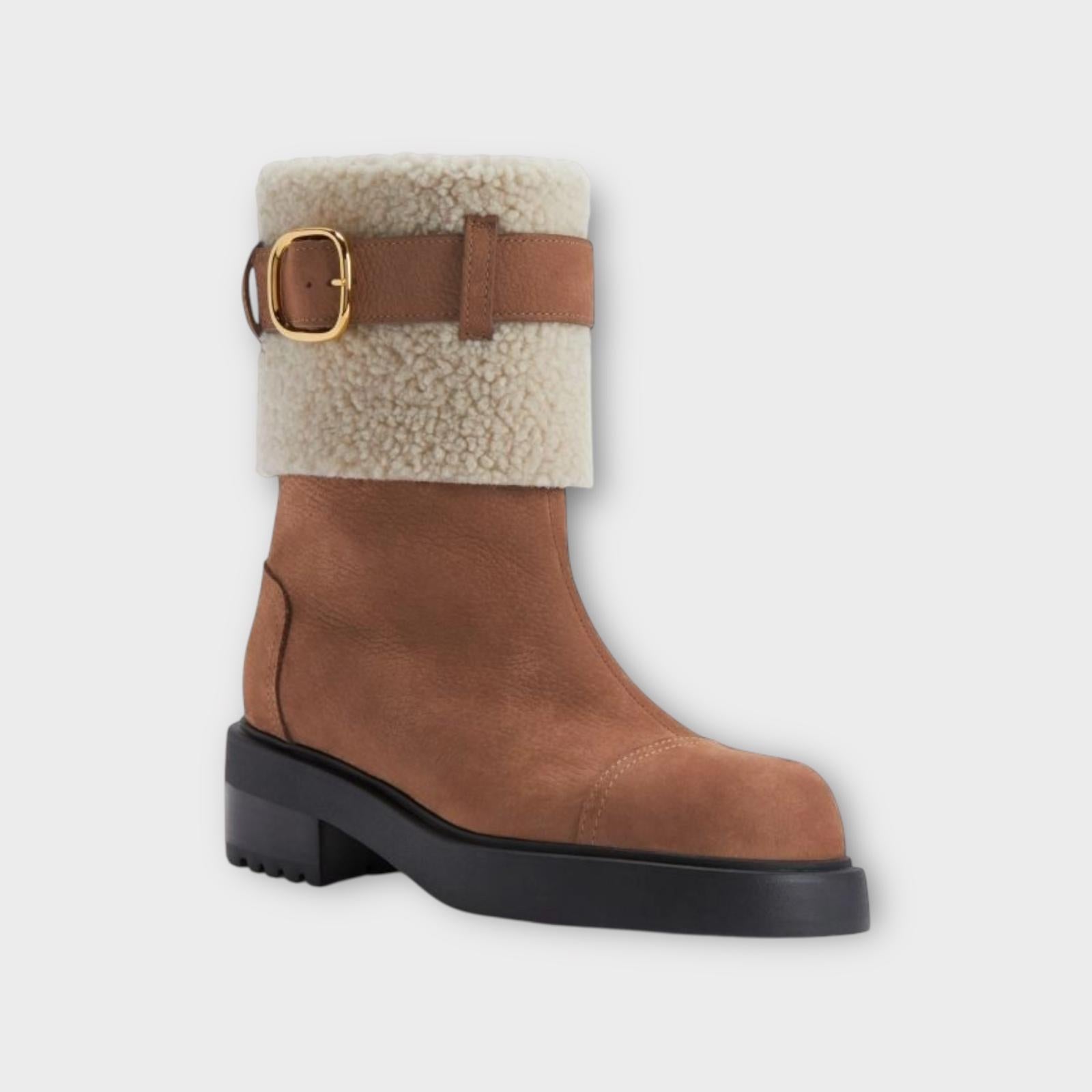 Nubuck leather ankle boots with fur cuff, decorative buckle and rubber sole.