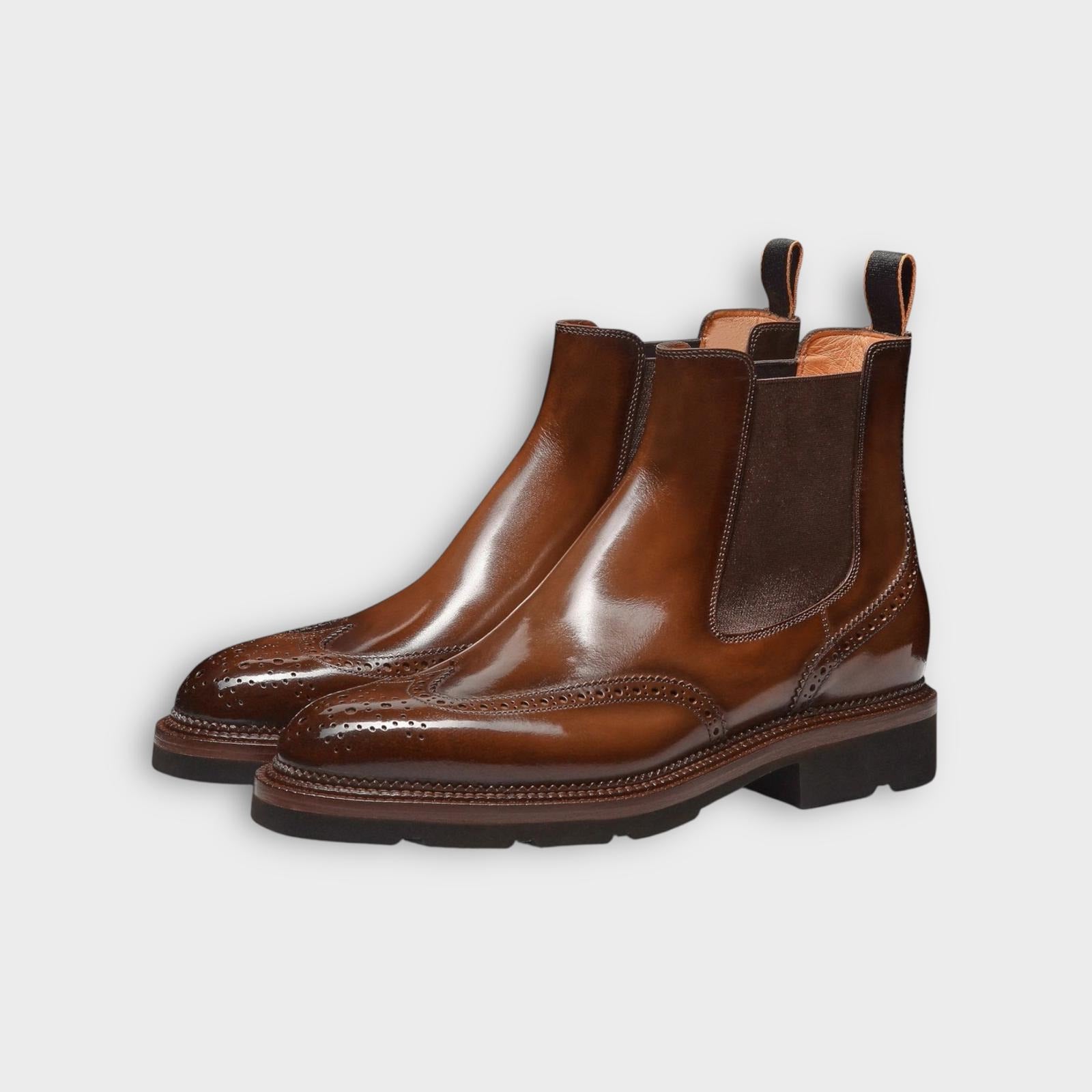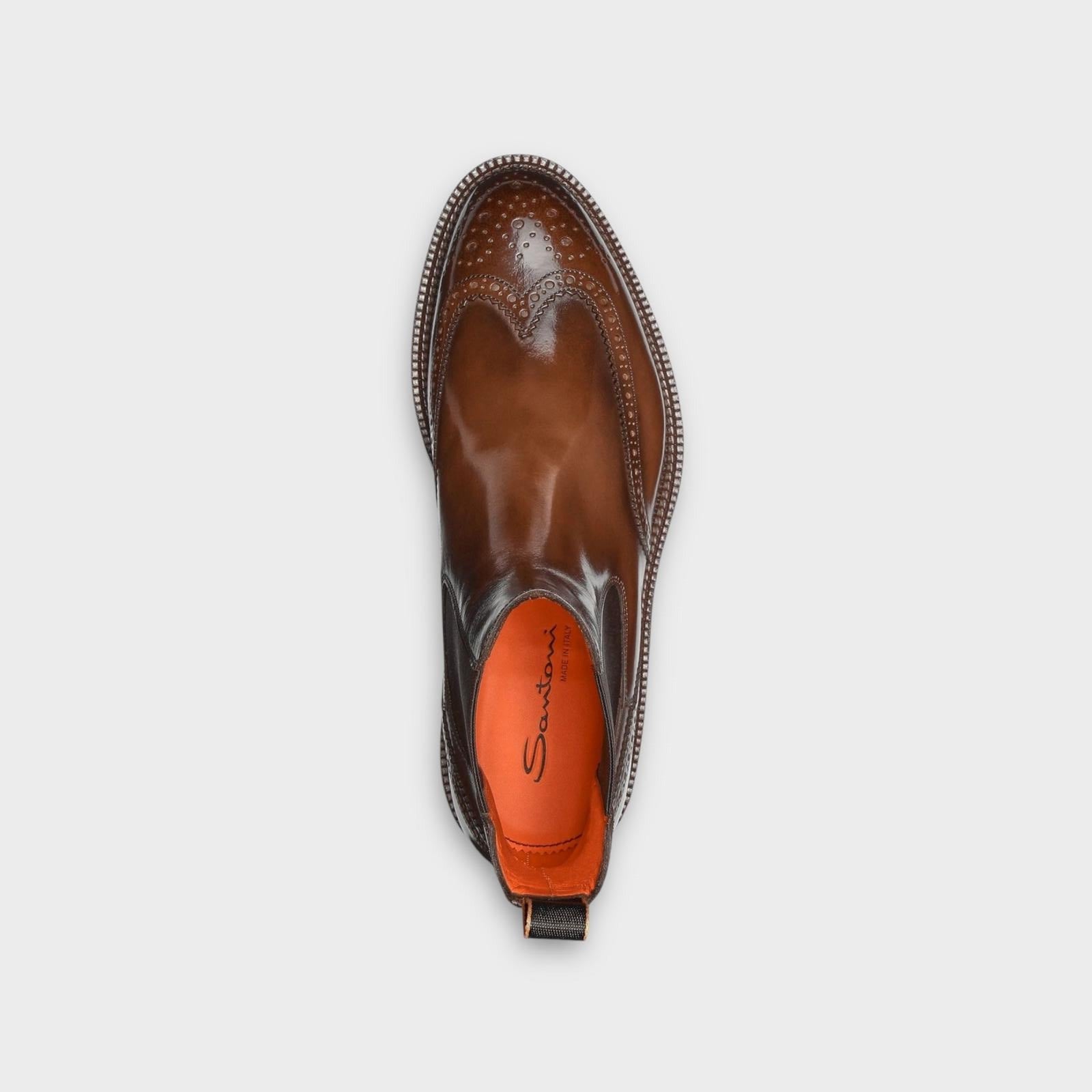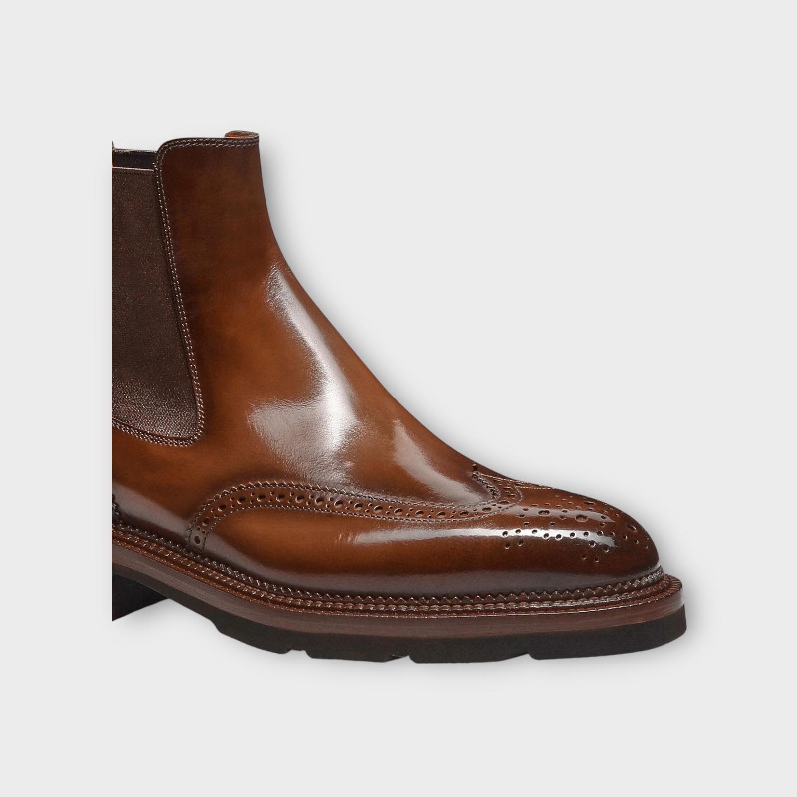 Classic elegance meets contemporary charm. This Chelsea boot is crafted from fine leather, enriched with brogue detailing and our artisanal “velatura” gradated finish, resulting in rich nuances that are unique to each and every shoe. Elasticated inserts on the sides and a pull tab on the back make slipping it on and off a breeze, while a multi-layer sole combines a leather welt with a chunky rubber tread.