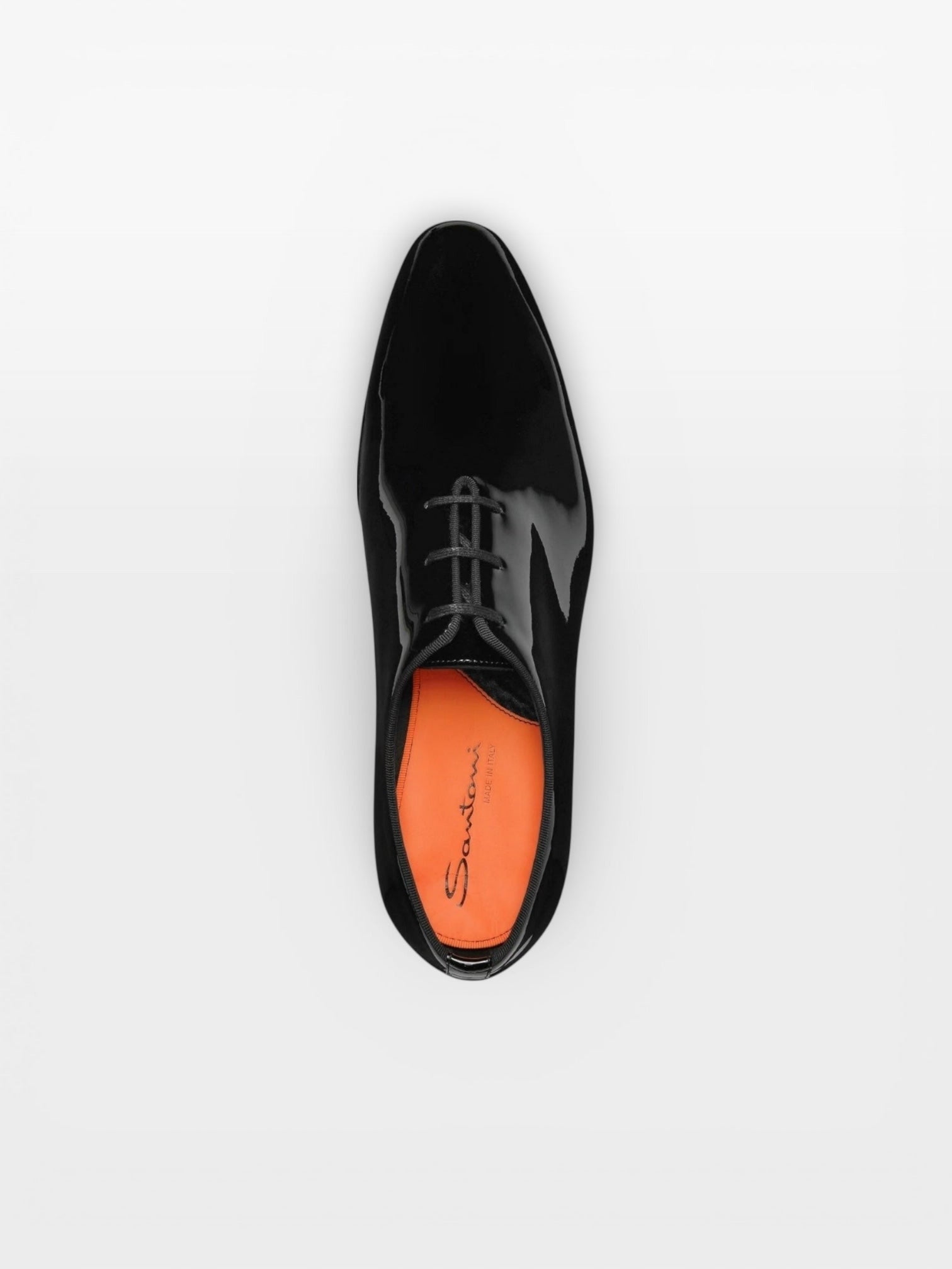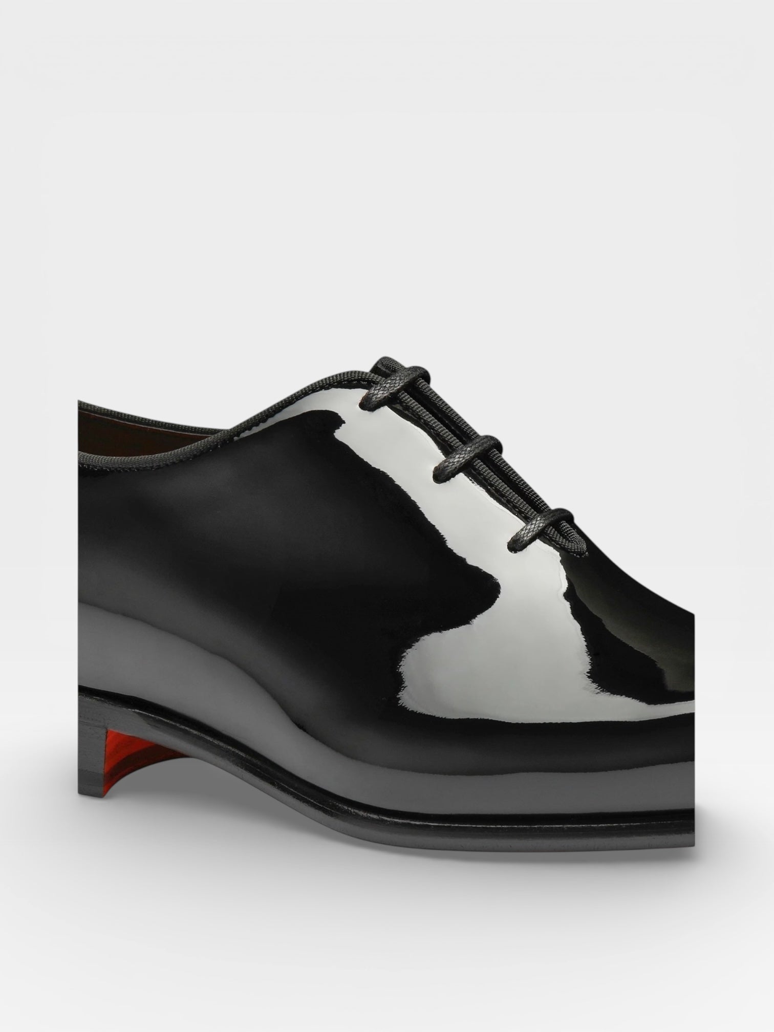 This Oxford lace-up exudes an exclusive allure, specially designed to add an extra-special touch to more formal outfits. Created entirely by hand, it flaunts a sleek, lightweight upper crafted from patent leather, constructed with stitching only on the heel. Grosgrain trims and laces elevate its otherwise its classic tapered silhouette.