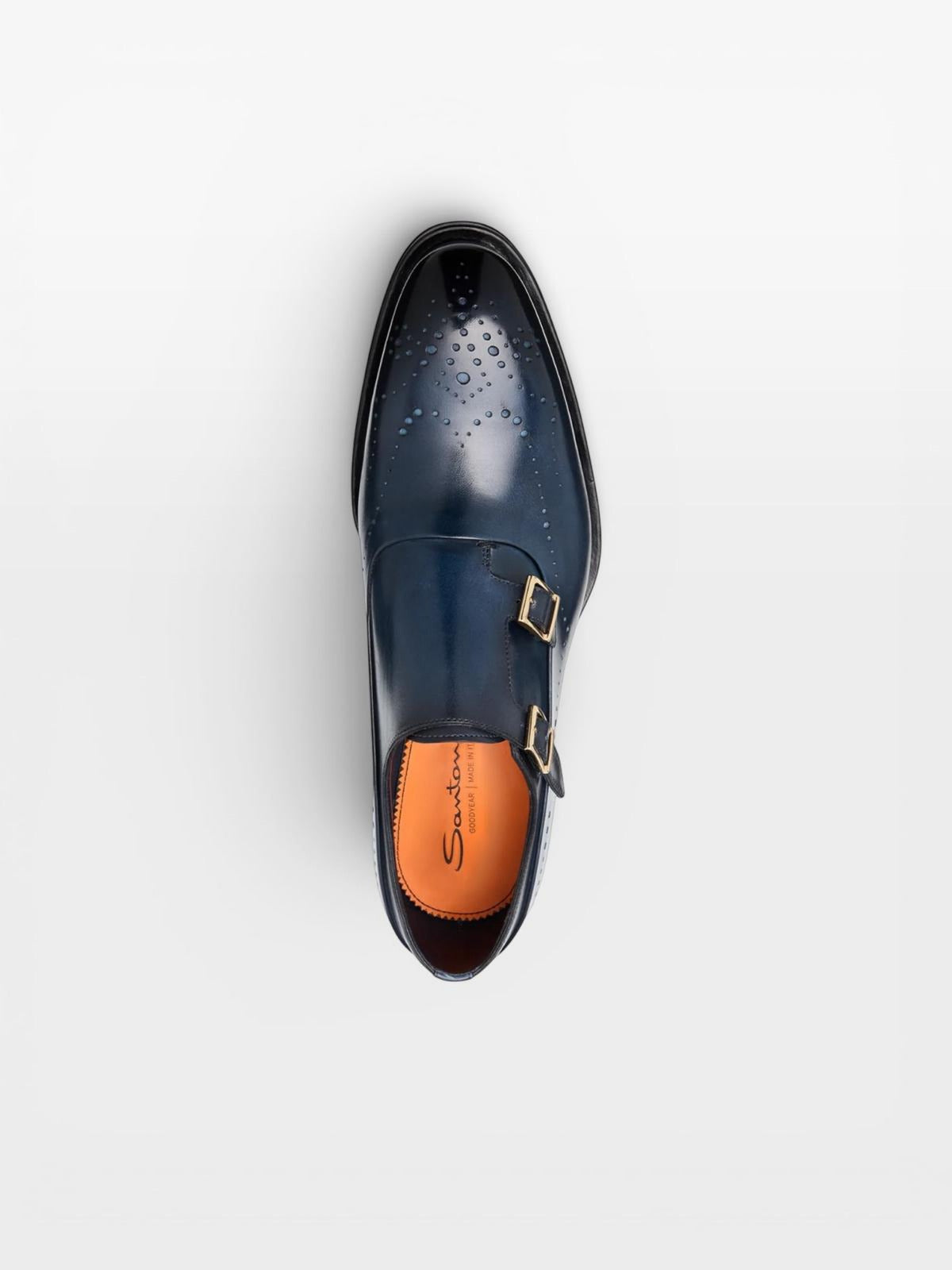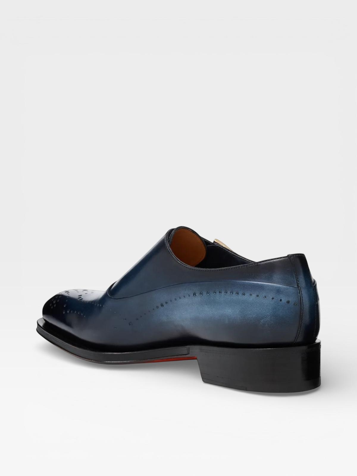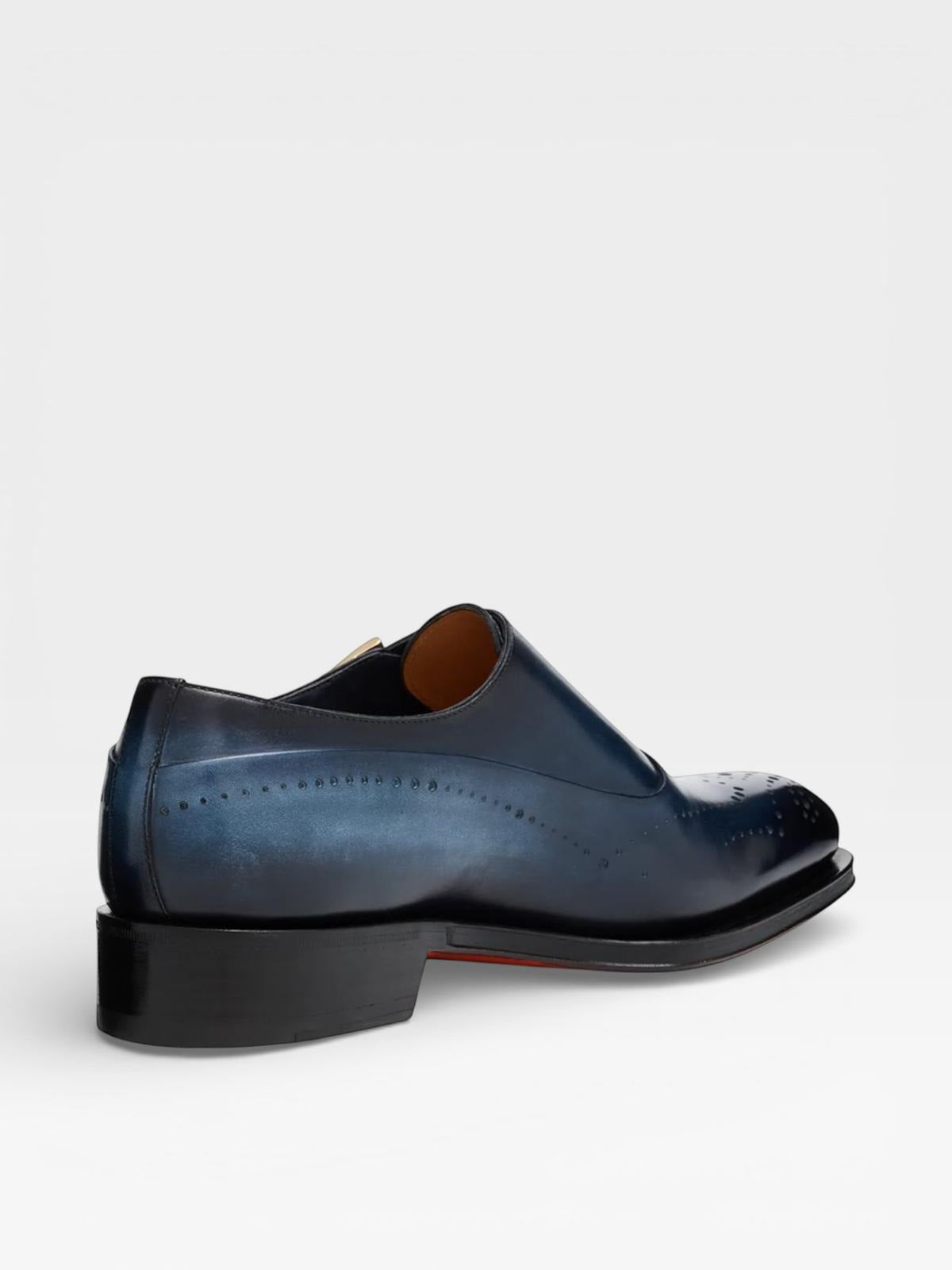 A style emblem and a Santoni icon. Sculpted to perfection to bring effortless charm to formal ensembles, this refined double-buckle brogue is crafted from fine Origine leather: full-grain calfskin in its most authentic state, left uncoated, unpigmented and perfectly natural. The only addition is our artisanal Velatura color-graded finish, creating a refined interplay of lustrous nuances that gracefully define the silhouette. Built with a Goodyear welt construction to ensure water-tightness, resistance and long-lasting elegance, wear after wear.