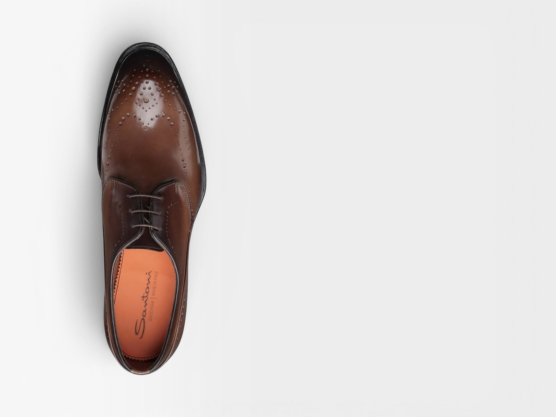 Sophisticated lines and understated brogue detailing. This Derby lace-up brings effortless elegance to work events and formal occasions, crafted from fine Origine leather: full-grain calfskin in its most authentic state, left uncoated, unpigmented and perfectly natural. The only addition is our artisanal Velatura color-graded finish, creating a refined interplay of lustrous nuances that gracefully define the silhouette. Built with a Goodyear welt construction to ensure water-tightness, resistance and long-lasting elegance, wear after wear.