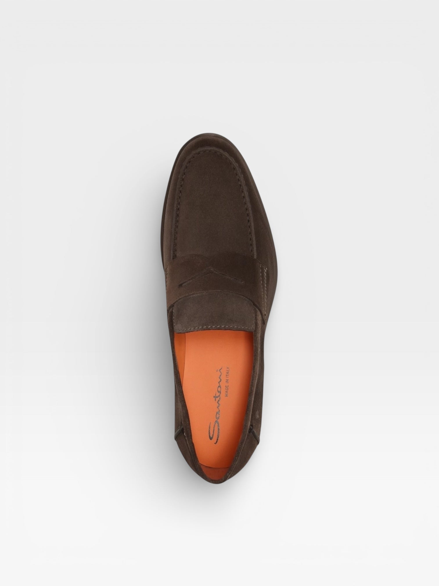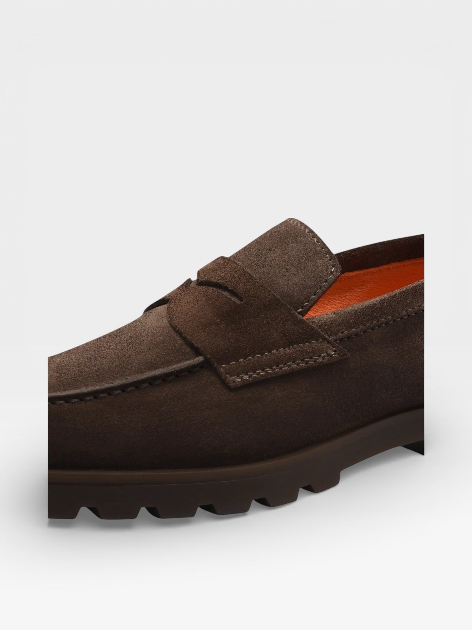 Specially designed with casual looks in mind, this Santoni loafer reinterprets the preppy icon with a more structured, modern look. This refined iteration cements our sharp eye for quality and detail with its luxurious suede construction, enriched with Santoni’s artisanal “velatura” gradated finish. Its lightweight construction is toughened up with a tonal chunky rubber sole.