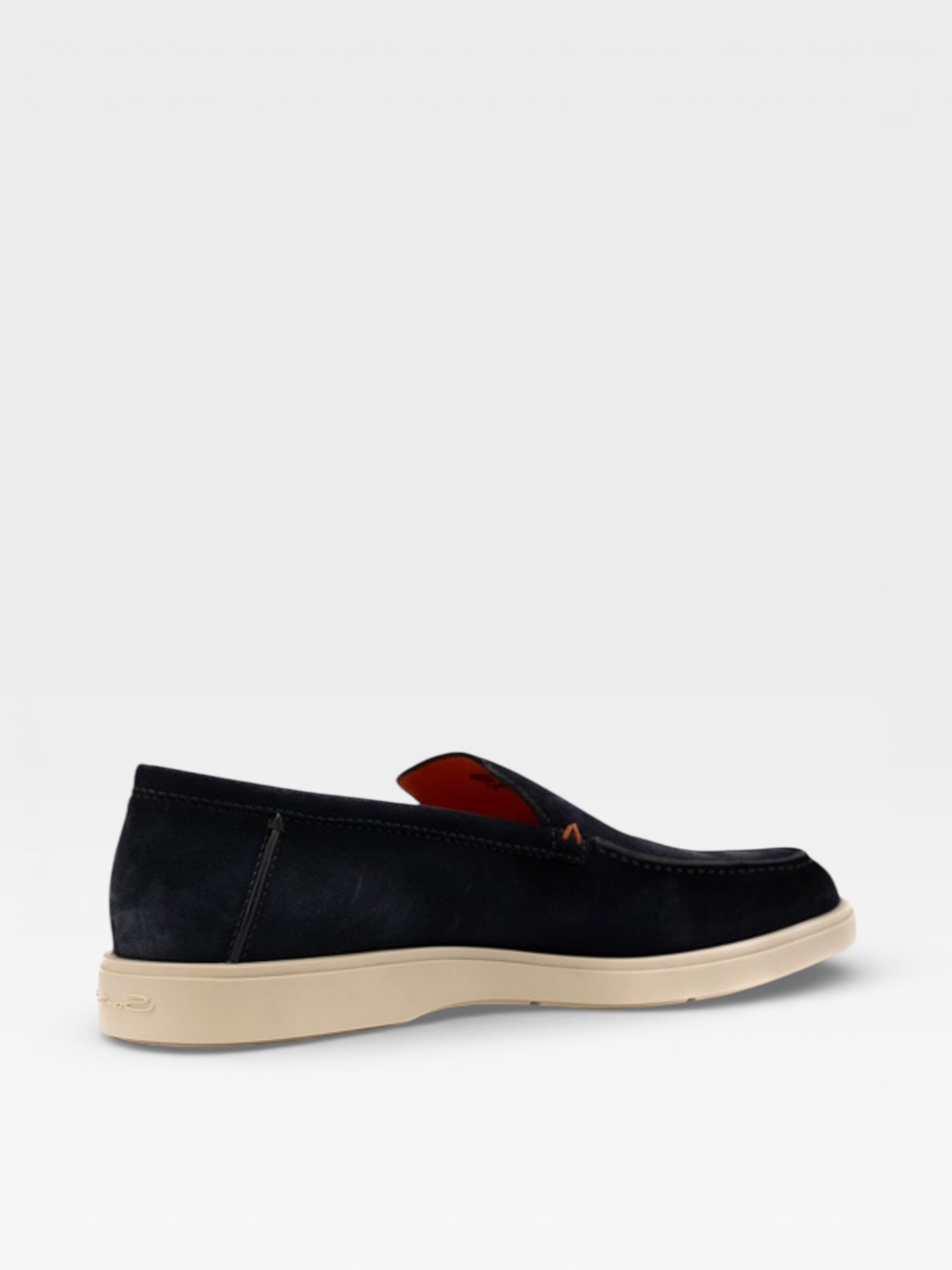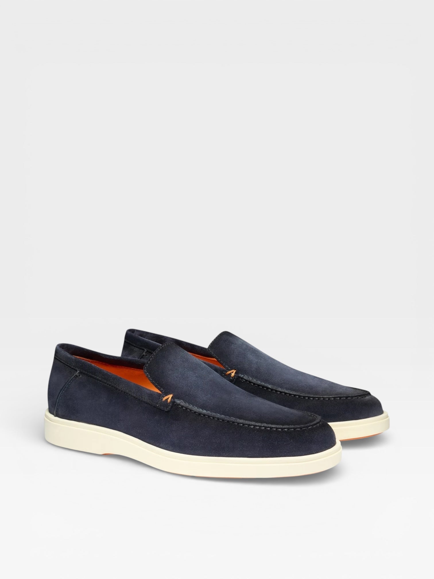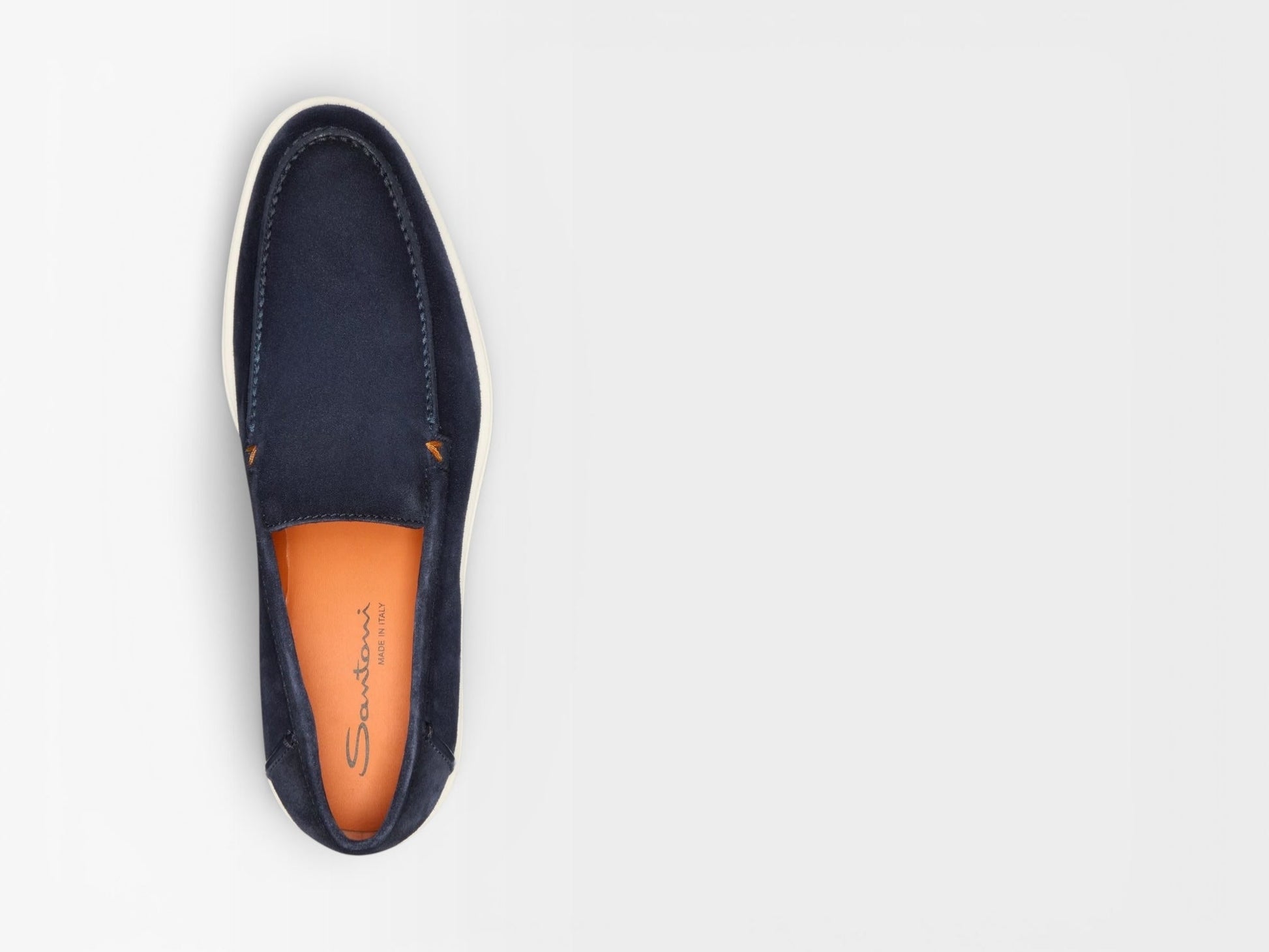 Distinguished by a delicate tapered silhouette, this loafer is dedicated to those with an understated style seeking effortless elegance even for informal occasions. Its premium suede upper and rubber sole offer a comfy, supportive feel, whilst orange details mark every stride with unmistakable Santoni attitude.