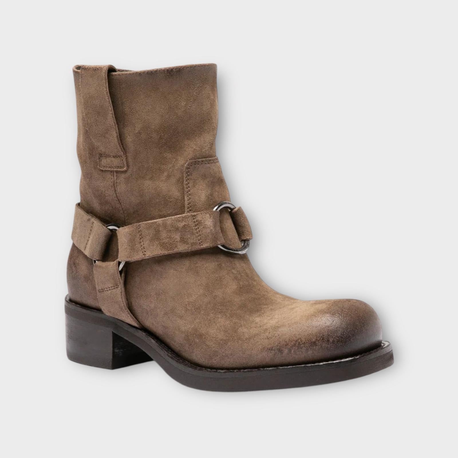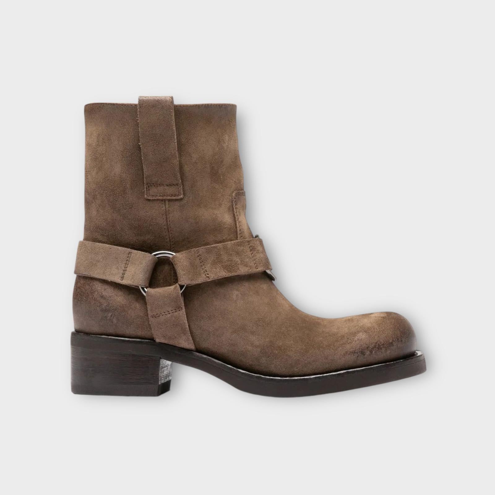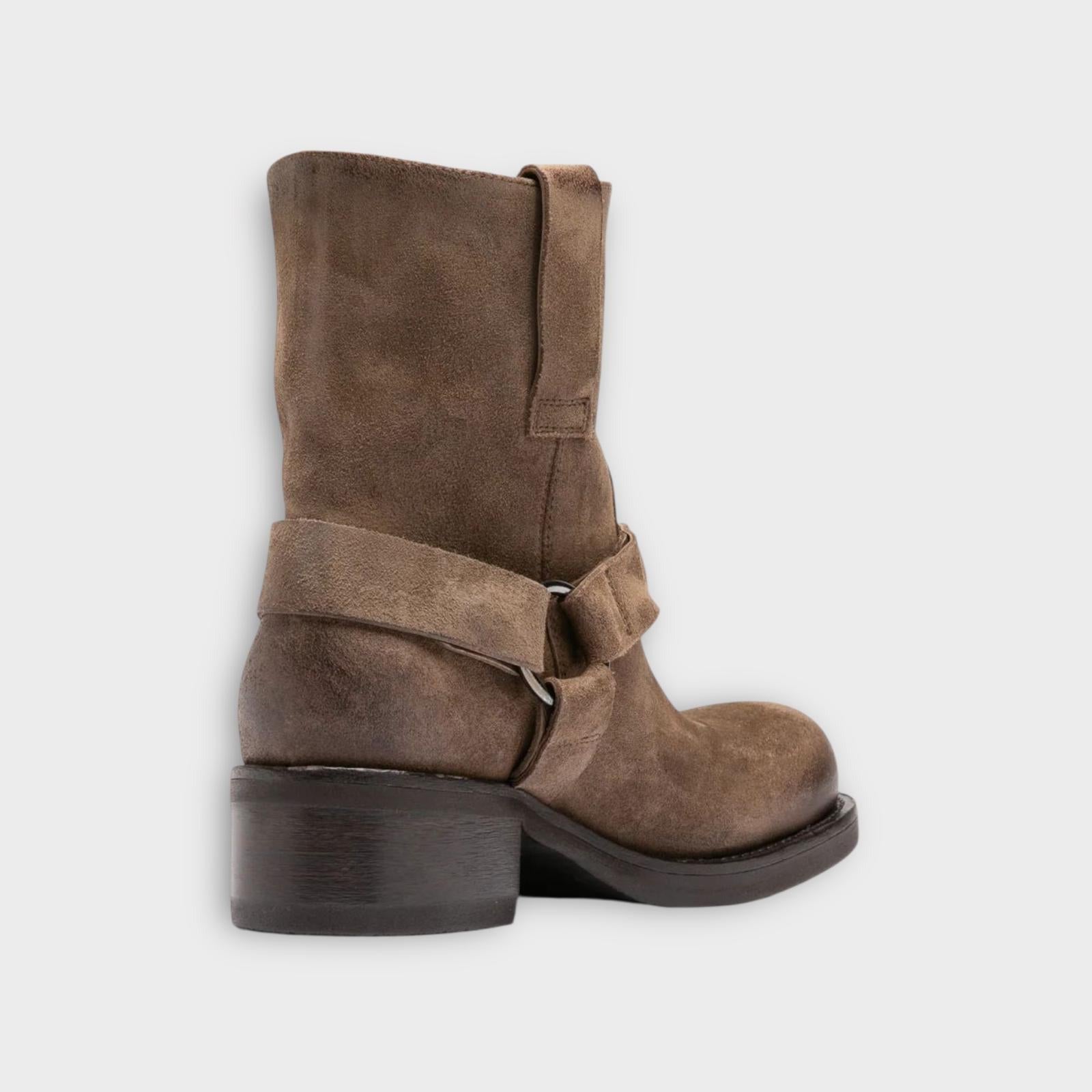 The Dana 003 boots are handcrafted from waxed taupe suede, featuring a pull-on silhouette enhanced by a harness strap and metal ring detail. A sturdy stacked heel provides stability, while the lightweight EVA sole ensures all-day comfort.