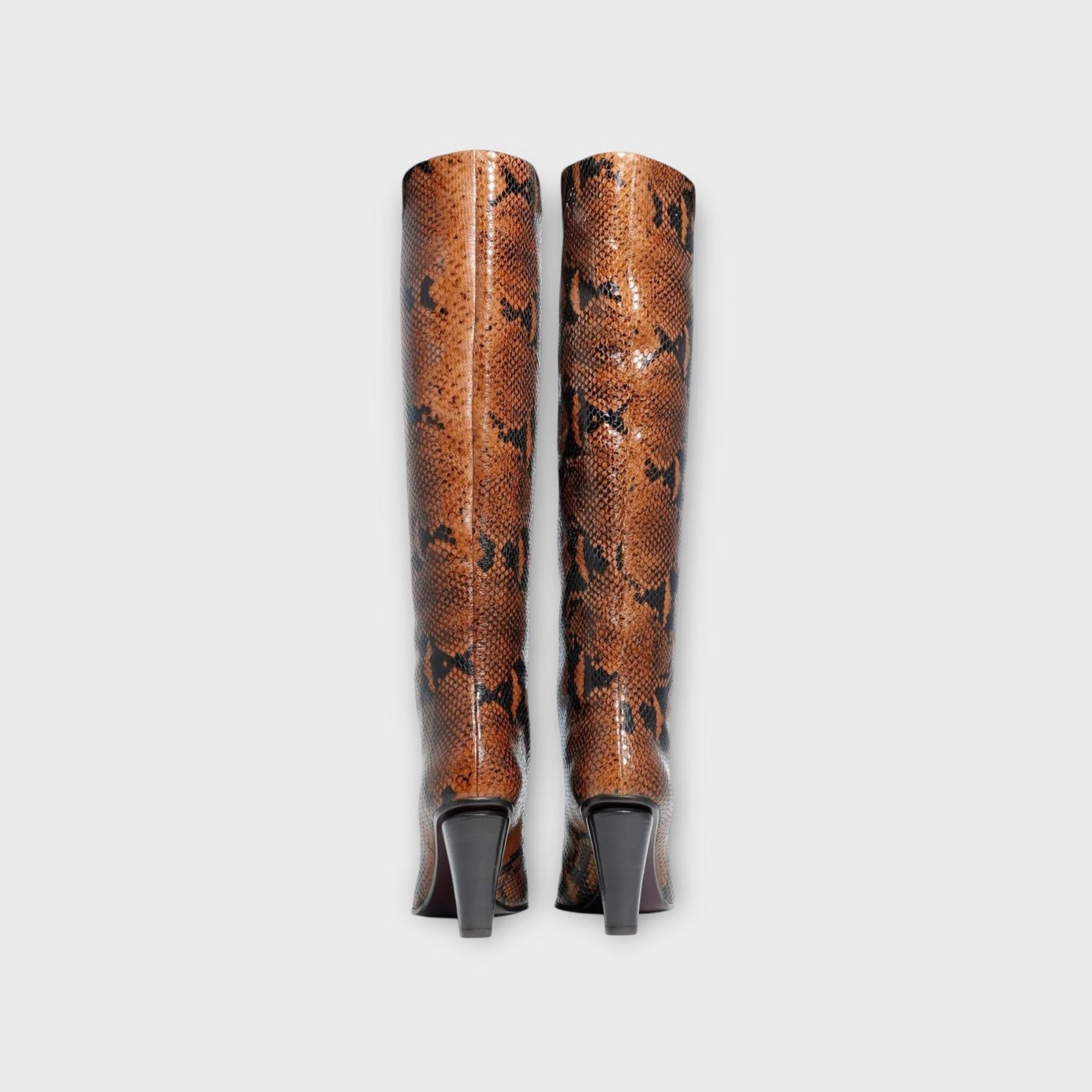 The knee-high, pointed-toe Riva boot is made of lambskin with a brown python print, which lends a touch of sophistication and originality. The 7 cm stiletto heel adds impetus and elegance, making it ideal for those looking for a sophisticated and assertive look.