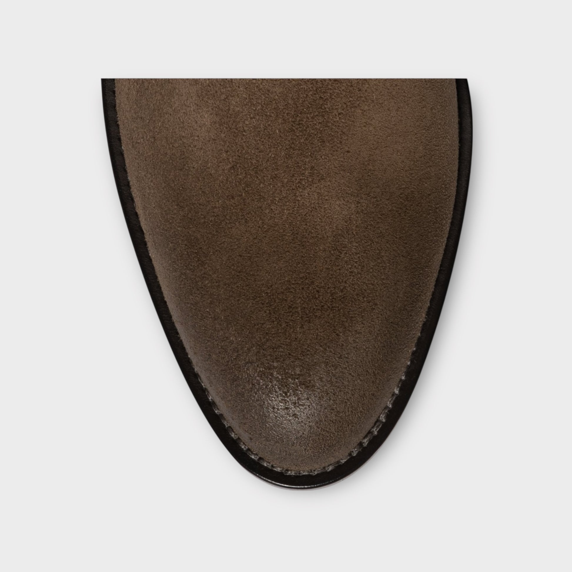 New boots made from very supple suede calfskin. They feature a strap and a lacquered western buckle. Blake-stitched leather heel and sole.