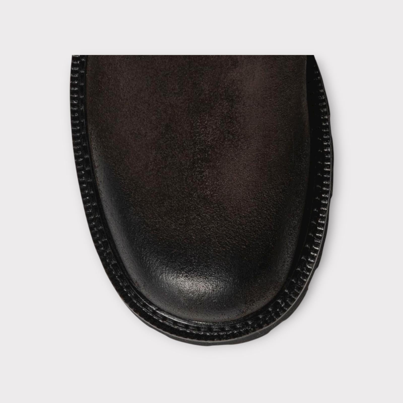 These new SARTORE boots are made of suede. They are decorated with a flange with a metal loop and a pull-out. Sole in rubber.