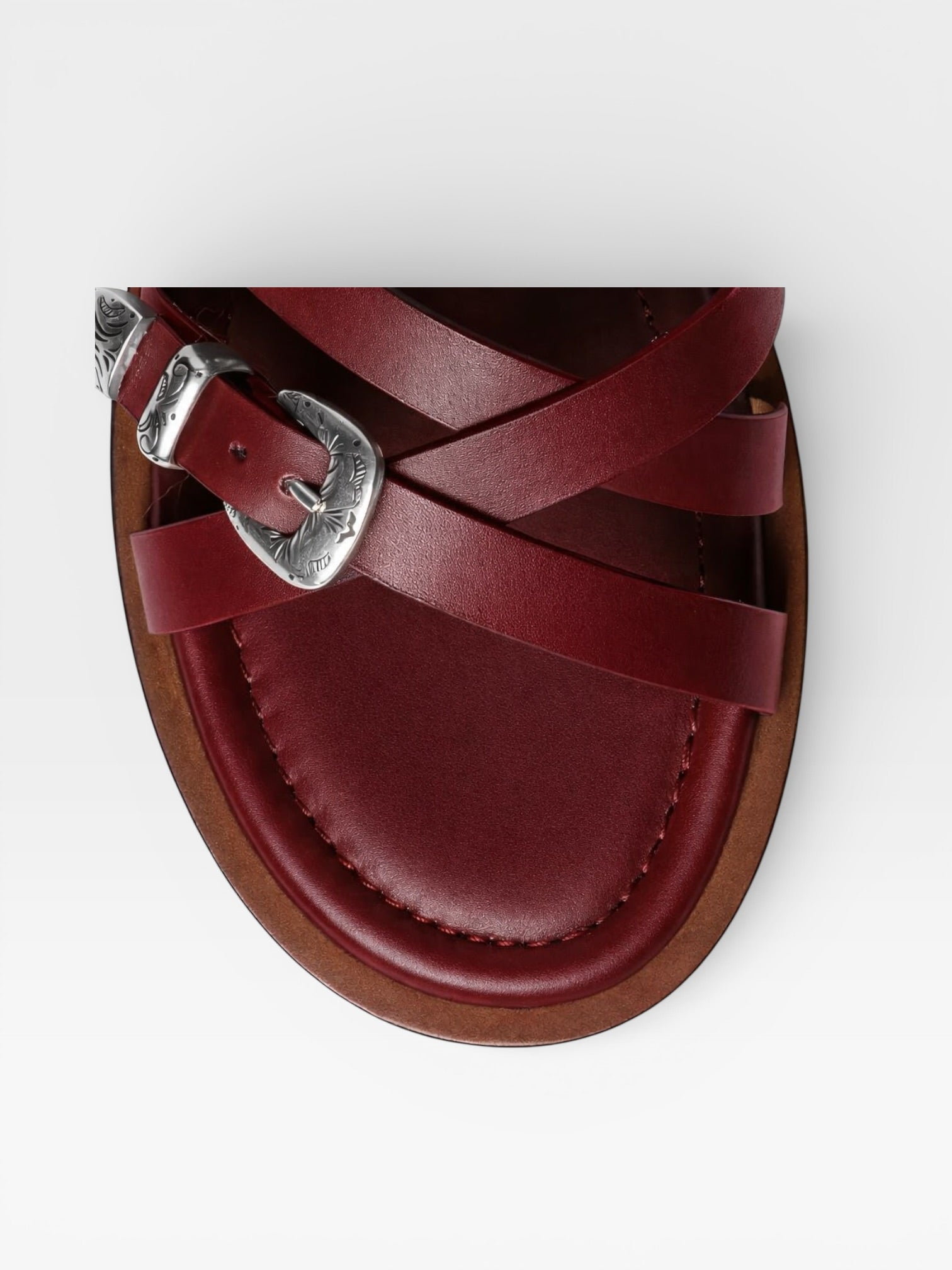 Slides made in veal tanning calf very flexible. They are decorated with intertwined flanges and western belt buckles. Leather sole.