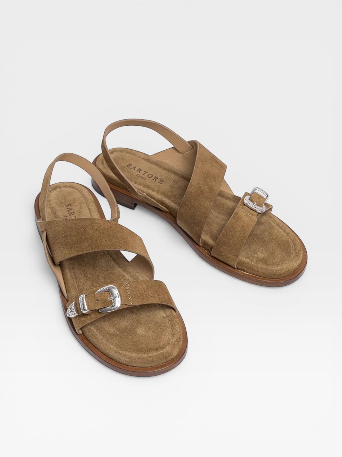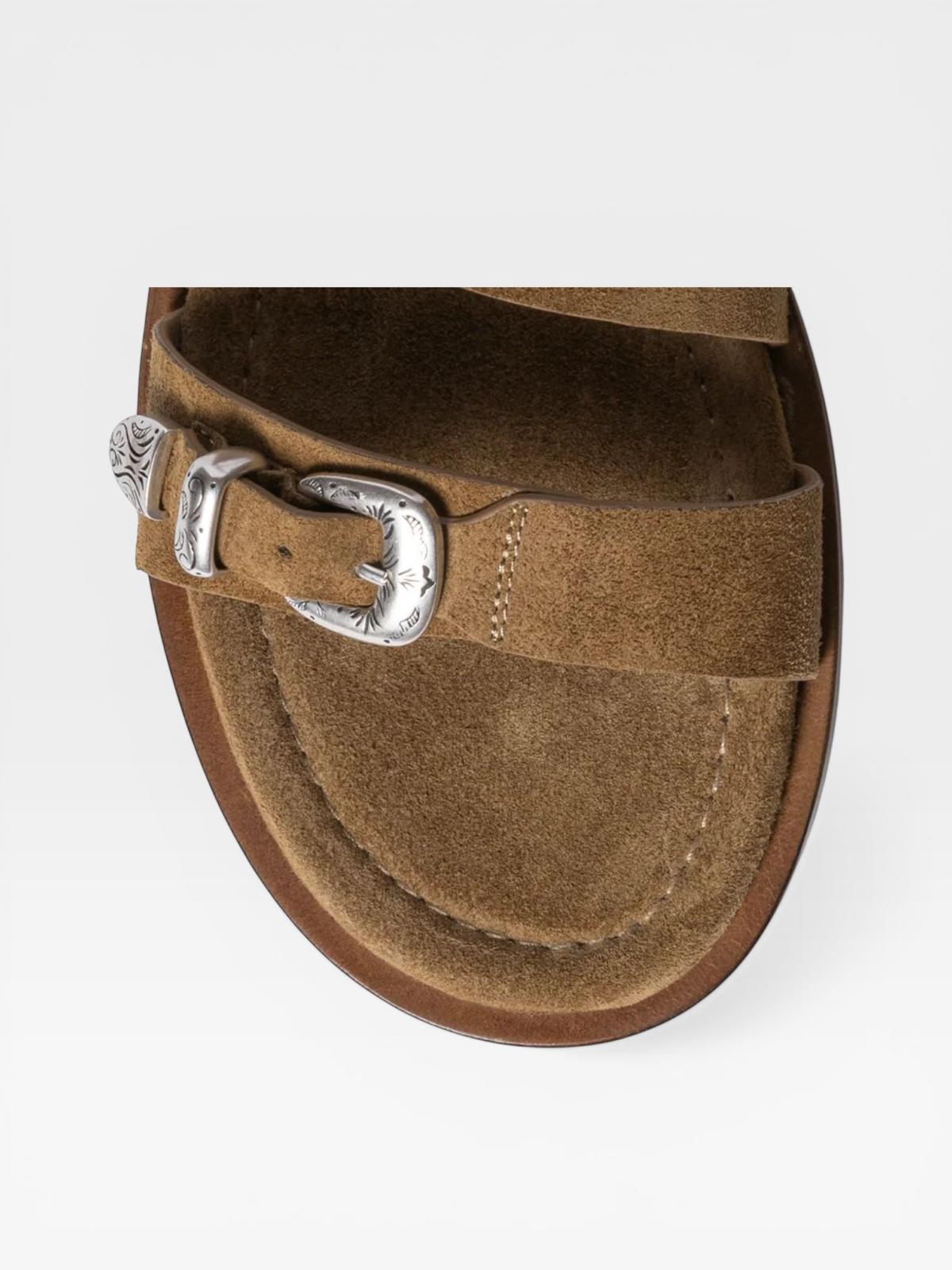 Sandals made in veal velvet tanning veal very flexible. They are decorated with intertwined flanges and western belt buckles. Leather sole.