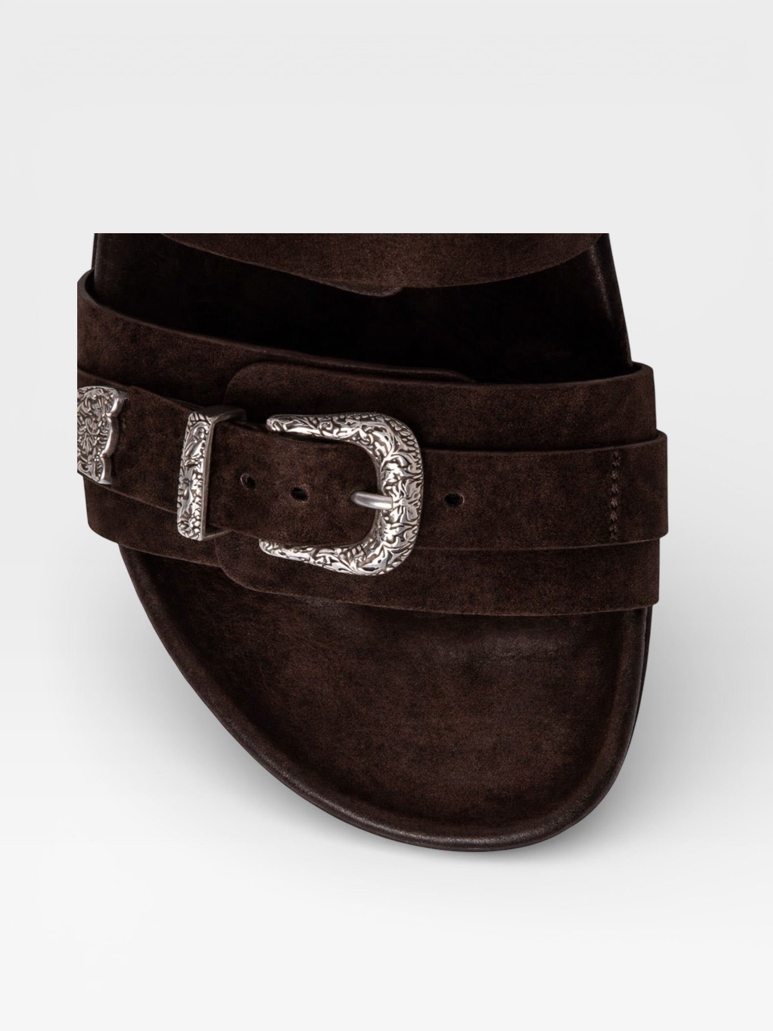 Fussbett made of suede leather cow and adorned with our western curls in silver brass. The anatomical sole ensures optimal comfort.