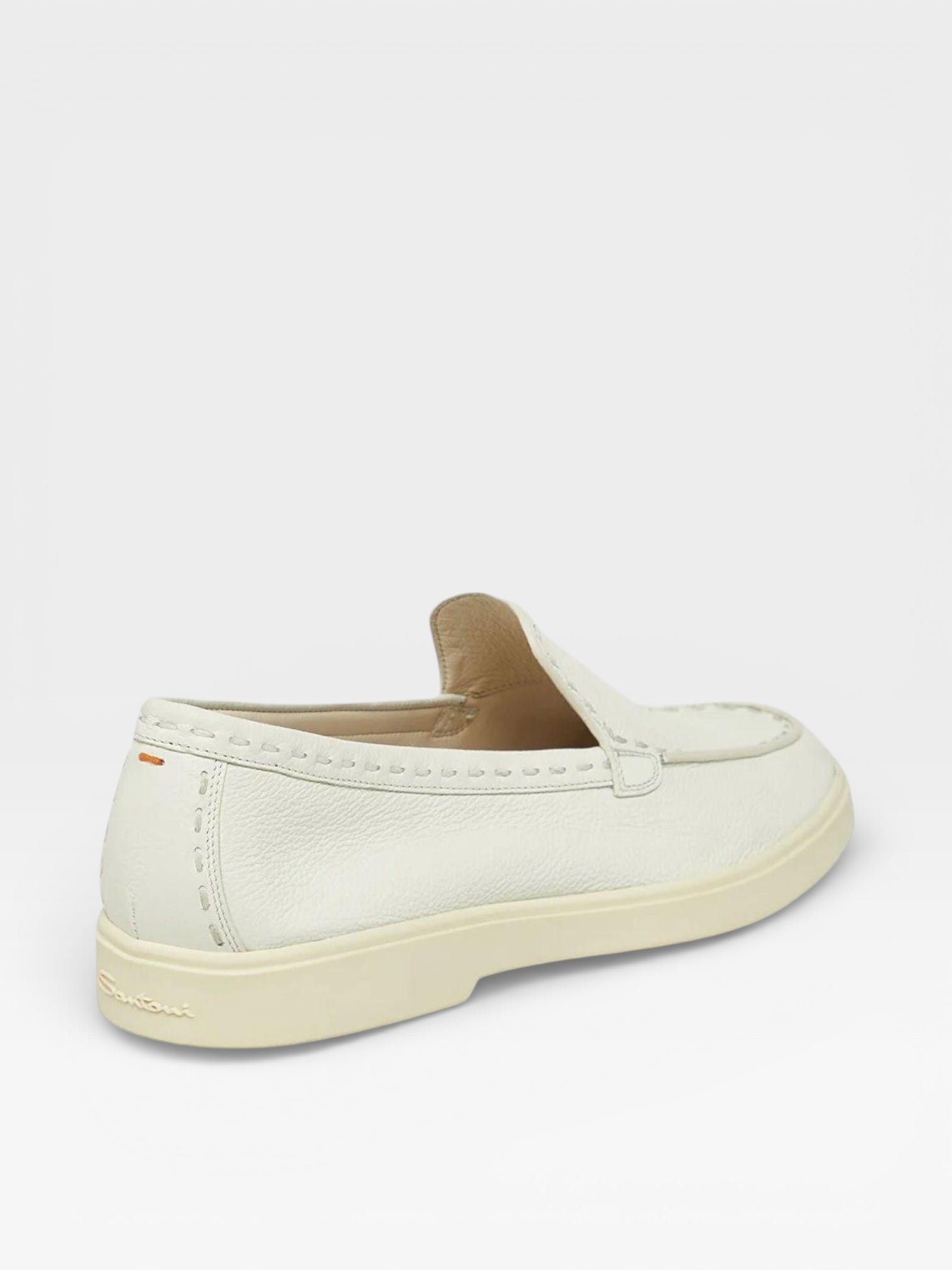 Santoni reinterprets the casual loafer with feminine proportions, fine materials and elegant craftsmanship, bringing charm and prestige to its timeless design. Its refined tumbled leather construction is enriched with hand-stitching in tonal thread. The rubber sole stands out in our iconic Arancio Santoni, revealing a flash of orange with each stride whilst ensuring maximum comfort from morning to night.